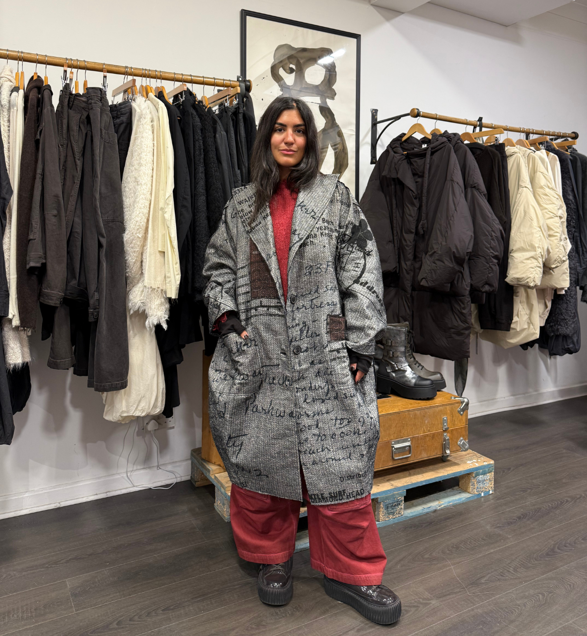 OUTFIT 2 - YAS MASHES UP THE CRAB COLOURWAY WITH A NEW IN STYLE COAT FROM RUNDHOLZ DIP FOR A GORGEOUS STATEMENT LOOK.