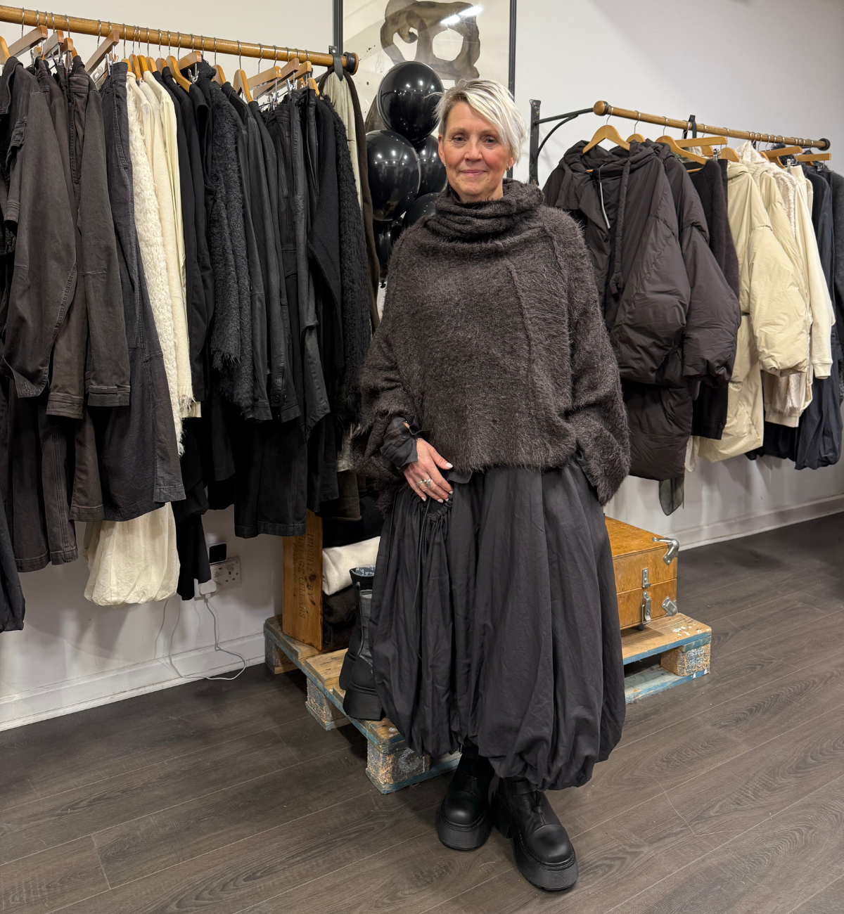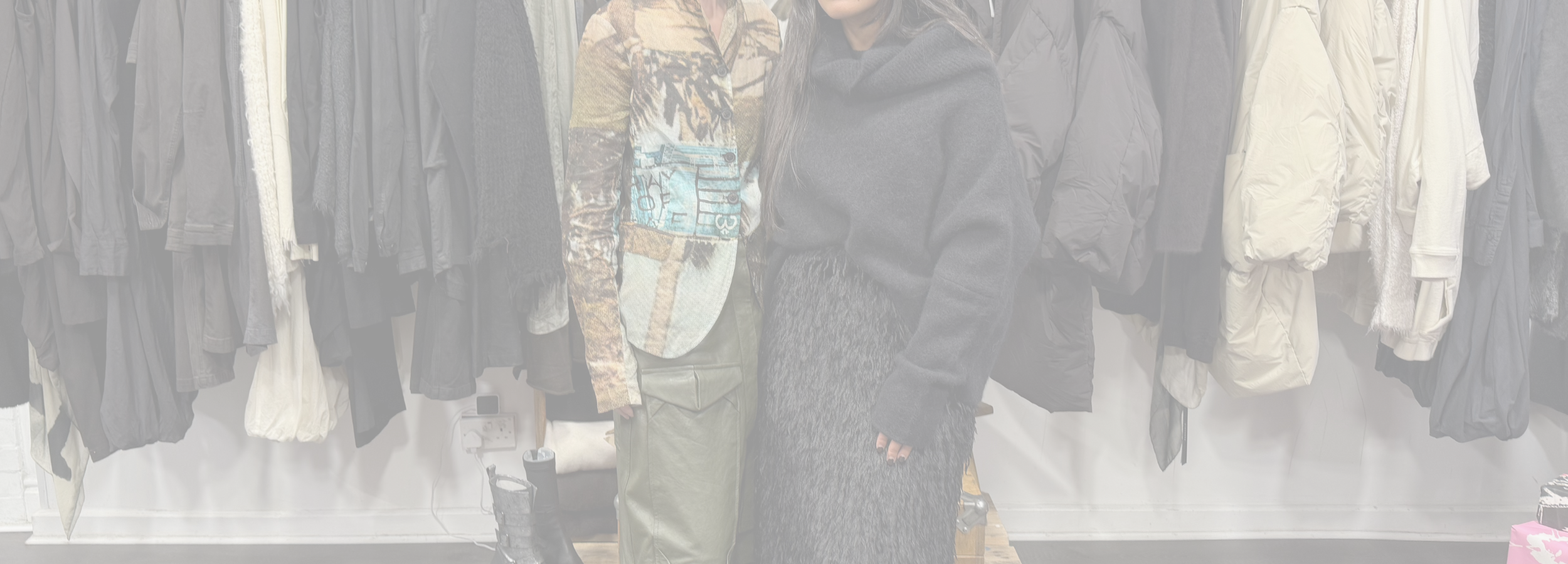 OUTFIT 1 - LAYERING UP FOR THE COLD, LIESA REACHES FOR THE BACKSIDE PRINT PIECES AND STYLES IT UP WITH THE NEW IN MAINLINE OVERCOAT IN TURF BLACK. SHE FINISHES THE LOOK WITH A DOM GOOR FUR GILET AND A DIP SAND TECHNO JACKET.