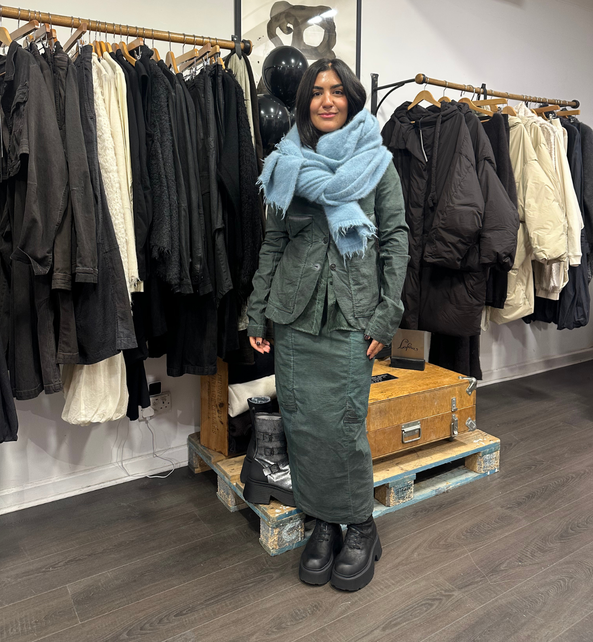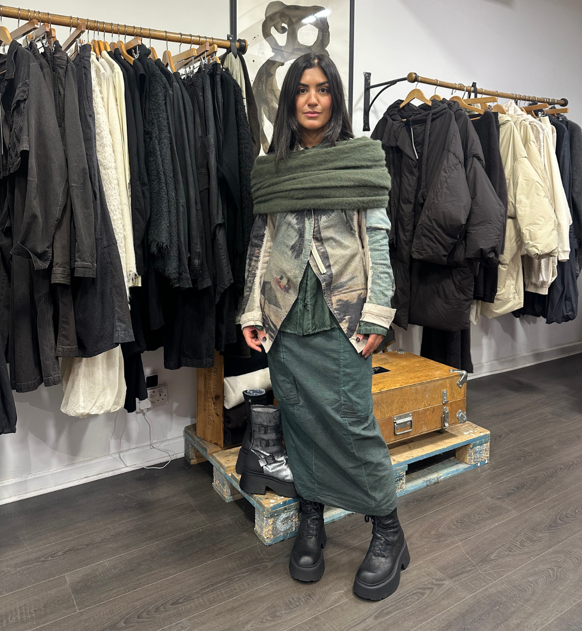 OUTFIT 1 - Yas starts off in a pine focused outfit, layering with the scene print Jacket which completes the look perfectly. She pairs the techno stretch skirt with a CUPRO shirt, finishing it off with a fox hair scarf.