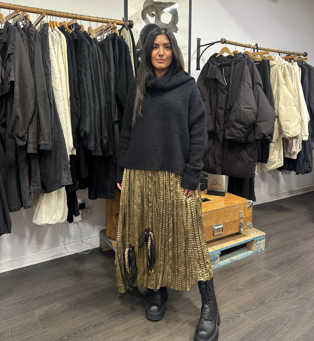OUTFIT 3 - YAS PAIRS UP THE STATEMENT ALEKSANDR MANAMIS GOLD SKIRT WITH THE ALPACA-MIX PULLOVER FROM SORT AARHUS.