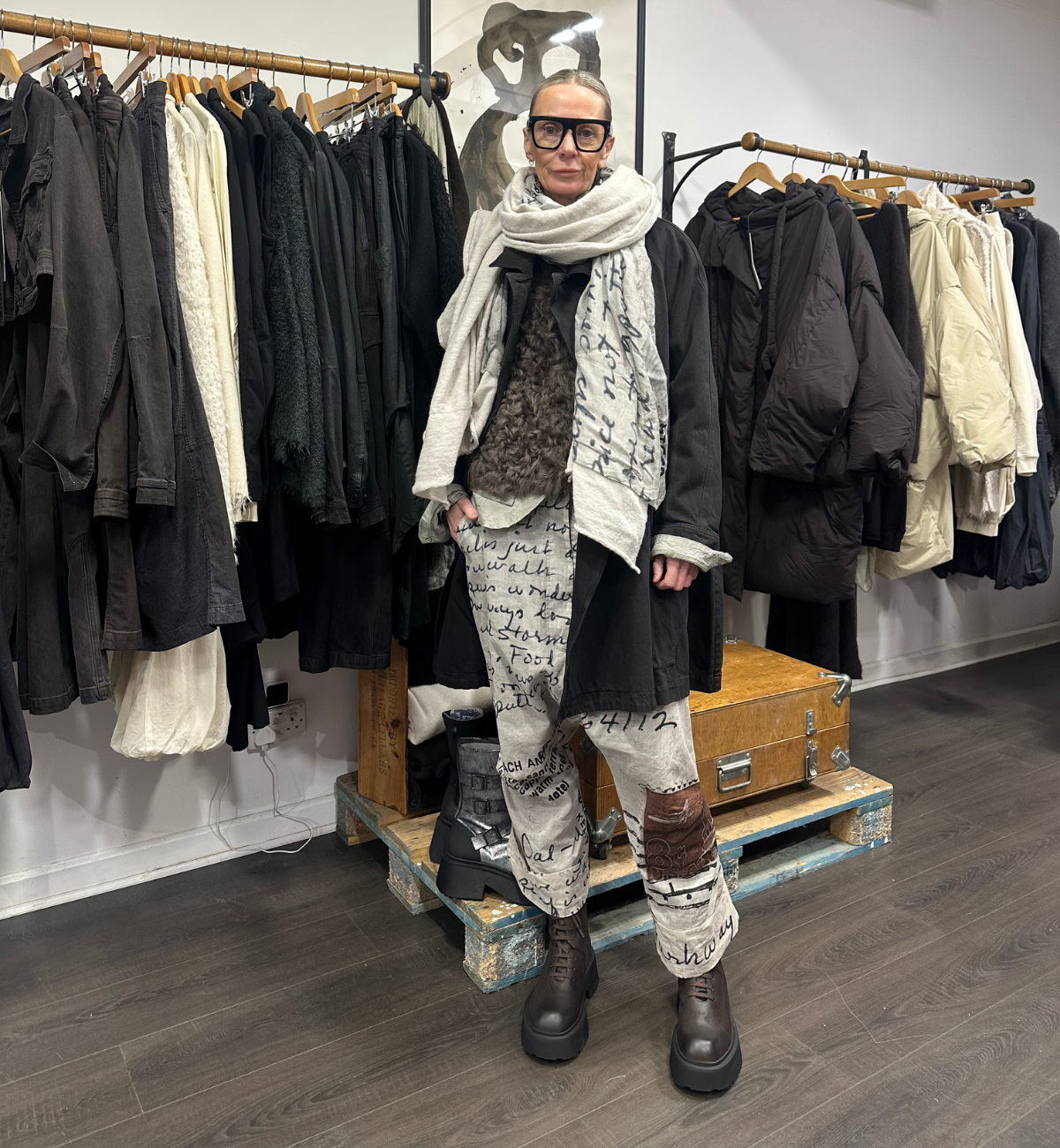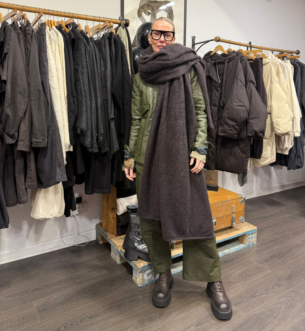 OUTFIT 2 - LIESA STYLES UP HER FAVOURITE LEATHER CO-ORD FROM RUNDHOLZ DIP IN THE PINE COLOUR WITH THE BERMUDA PRINT JACKET AND FINISHES IT OFF WITH A TURF RACOON SCARF.