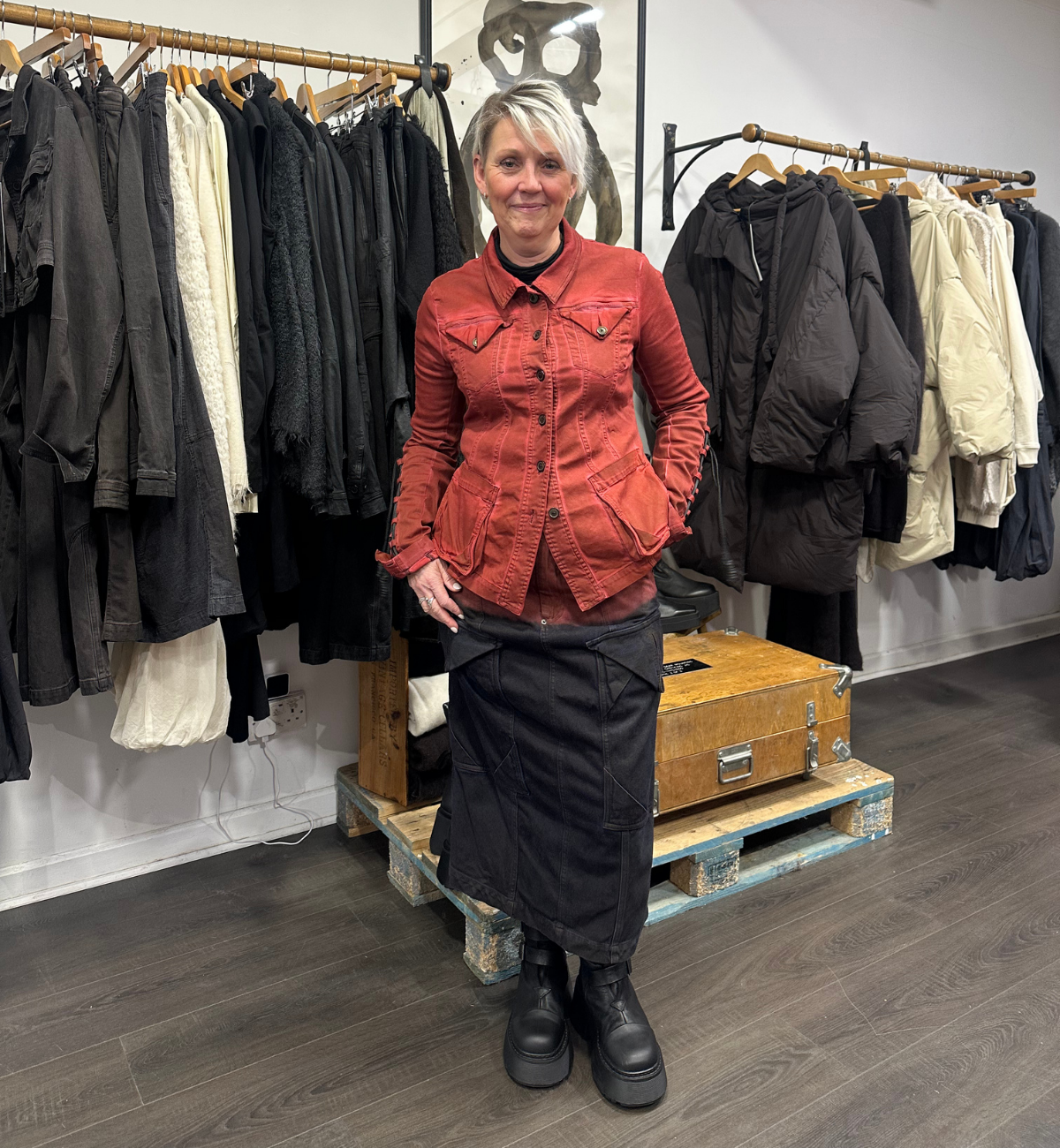OUTFIT 1 - STYLING UP THE CRAB PIECES, KIRSTIE PAIRS THE STRETCH DENIM JACKET WITH LEATHER DETAILS AT THE CUFF AND THE TIE-DYE SKIRT WITH A PAIR OF CLASSIC BIKER BOOTS FROM SORT AARHUS.