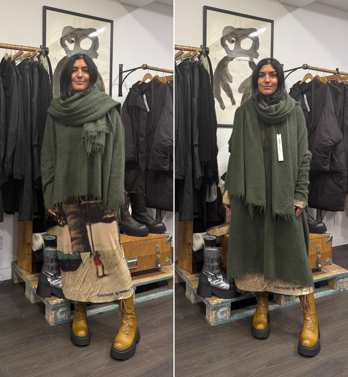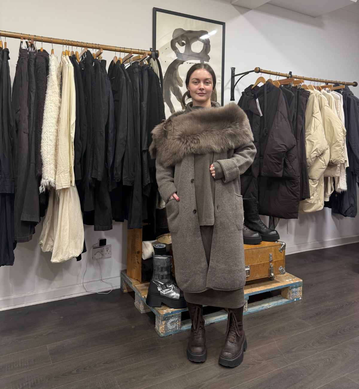 OUTFIT 2 - LYDIA SHOWS AN EFFORTLESS COLOUR MATCH WITH THE RINDE FROM MAMA B AND THE GREIGE FROM PAS DE CALAIS. SHE HAS LAYERED A DOM GOOR FUR SCARF WITH A LILLA SKIRT AND BILL PULLOVER FROM MAMA B.
