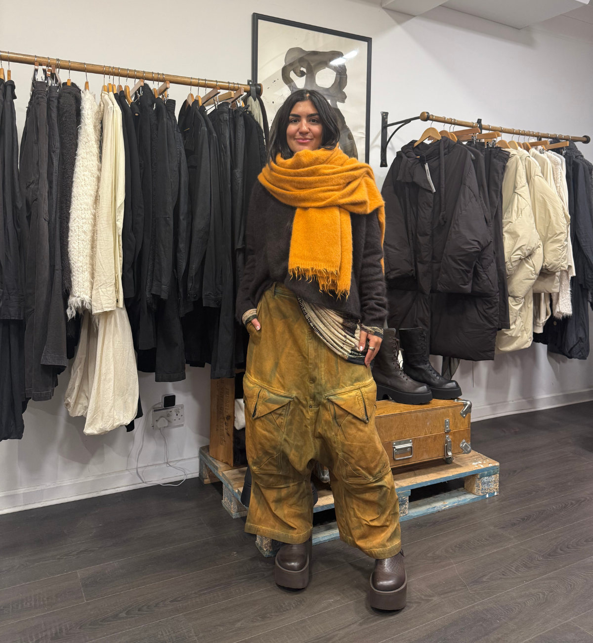OUTFIT 2 - PAIRING THE TURF RACOON PULLOVER WITH HER FIRST OUTFIT, YAS SHOWS HOW THE LAGOON LIGHT DENIM TROUSERS CAN BE PAIRED WITH ANYTHING! SHE FINISHES IT OFF WITH A SUN FOX HAIR SCARF.