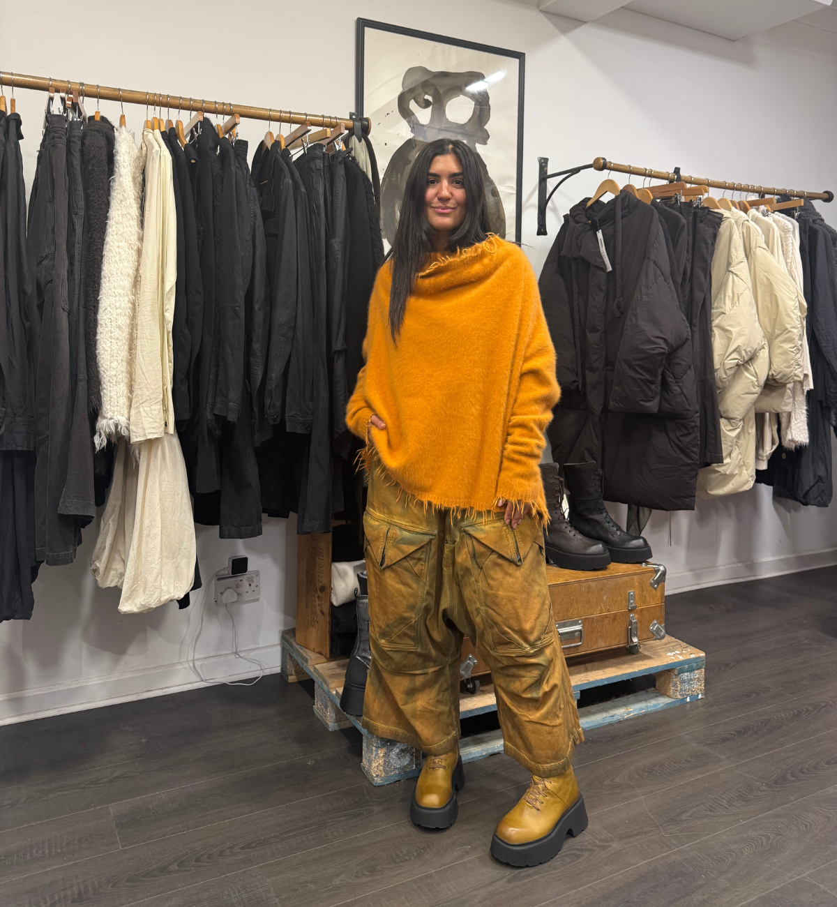 OUTFIT 4 - LASTLY, YAS SHOWS OFF THE SUN COLOUR IN THE FOX HAIR PULLOVER WITH THE ADJUSTABLE NECKLINE DESIGN. SHE THROWS ON THE PAS DE CALAIS JACKET FOR A FINAL LOOK.