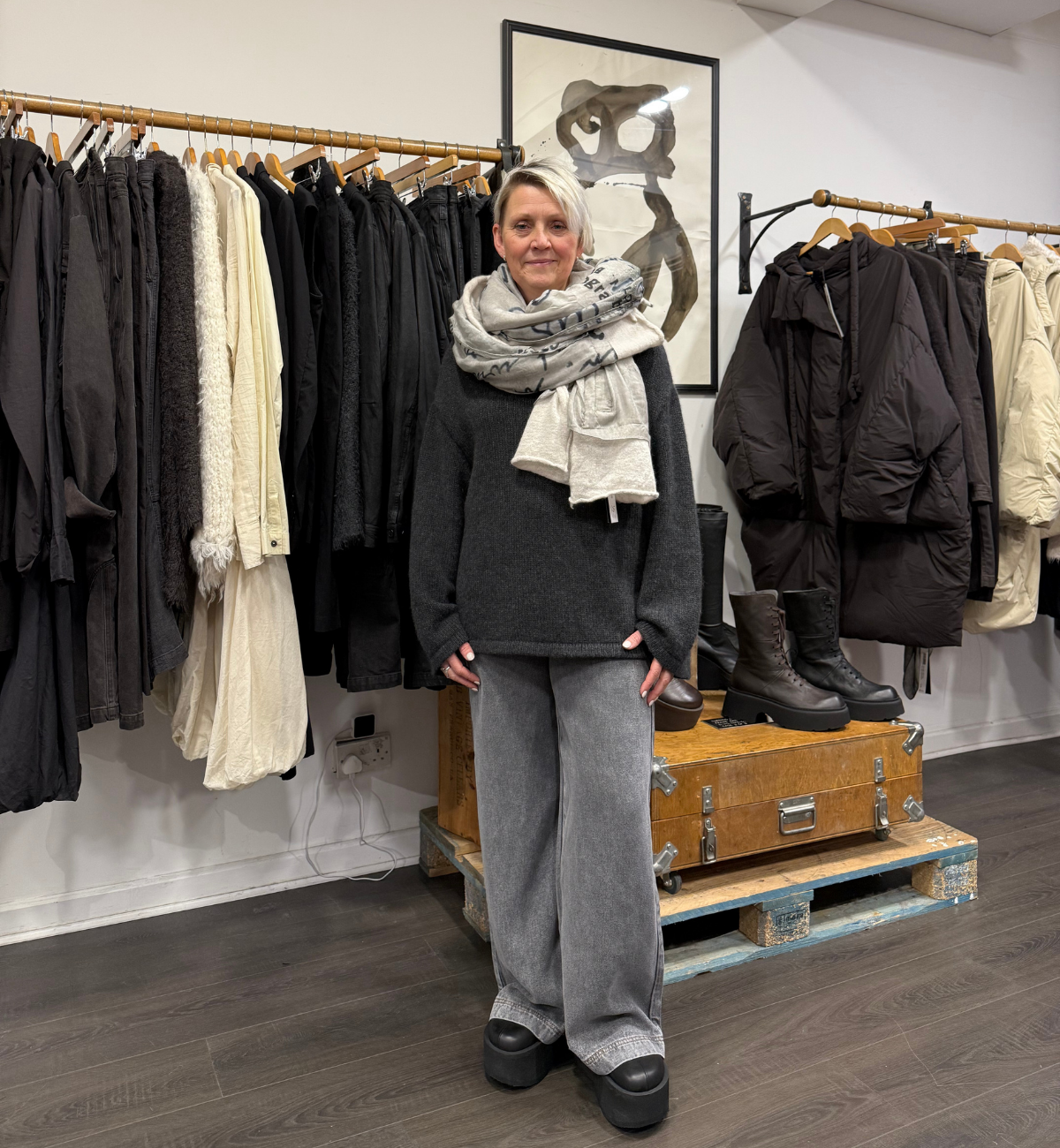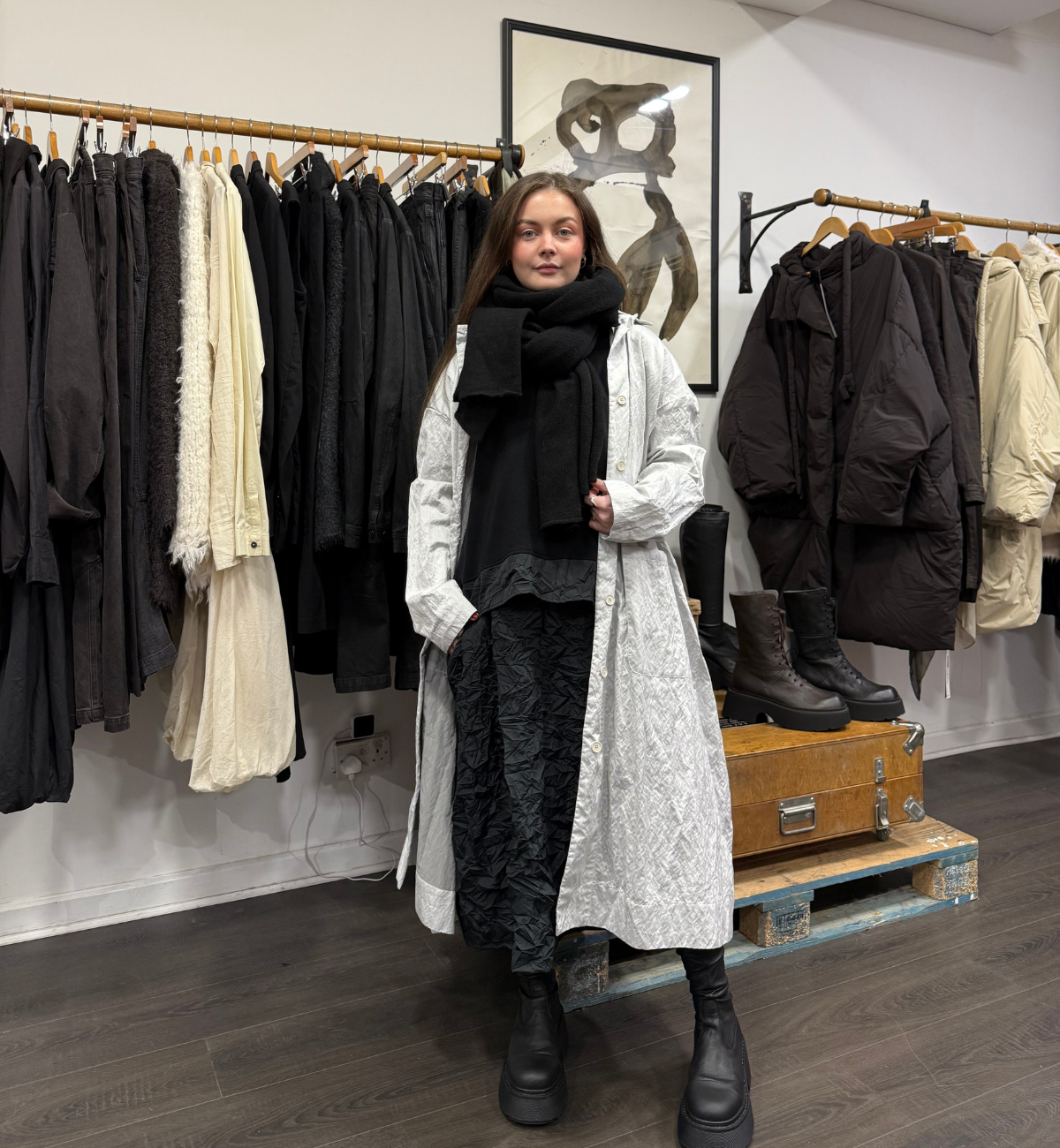 OUTFIT 1 - MASHING UP MAMA B, MANUELLE GUIBAL AND BLACK LABEL, LYDIA VENTURES INTO THE CRINKLE FABRIC. SHE LAYERS THE BAMBOO PULLOVER WITH THE ALMA DRESS FROM MAMA B, FINISHING IT OFF WITH A BLACK LABEL SCARF AND MANUELLE GUIBAL COAT.