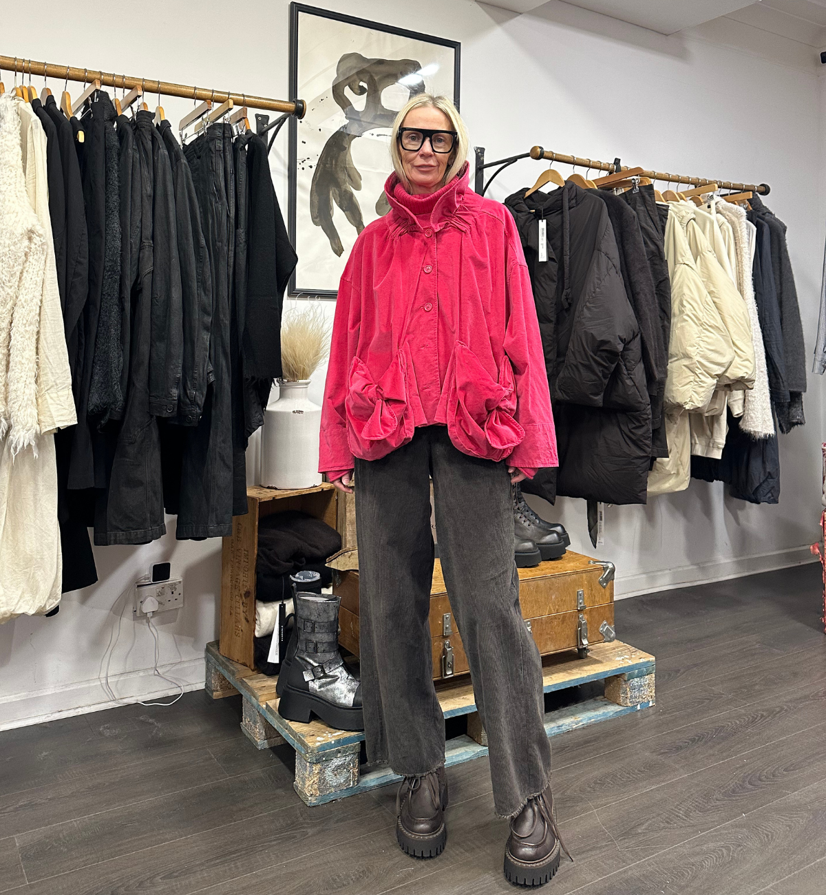 OUTFIT 1 - Liesa styles the Velvet RUNDHOLZ BLACK LABEL Jacket with the HANNOH WESSEL Cord trousers, finished with an oversized RUNDHOLZ BLACK LABEL Pullover.