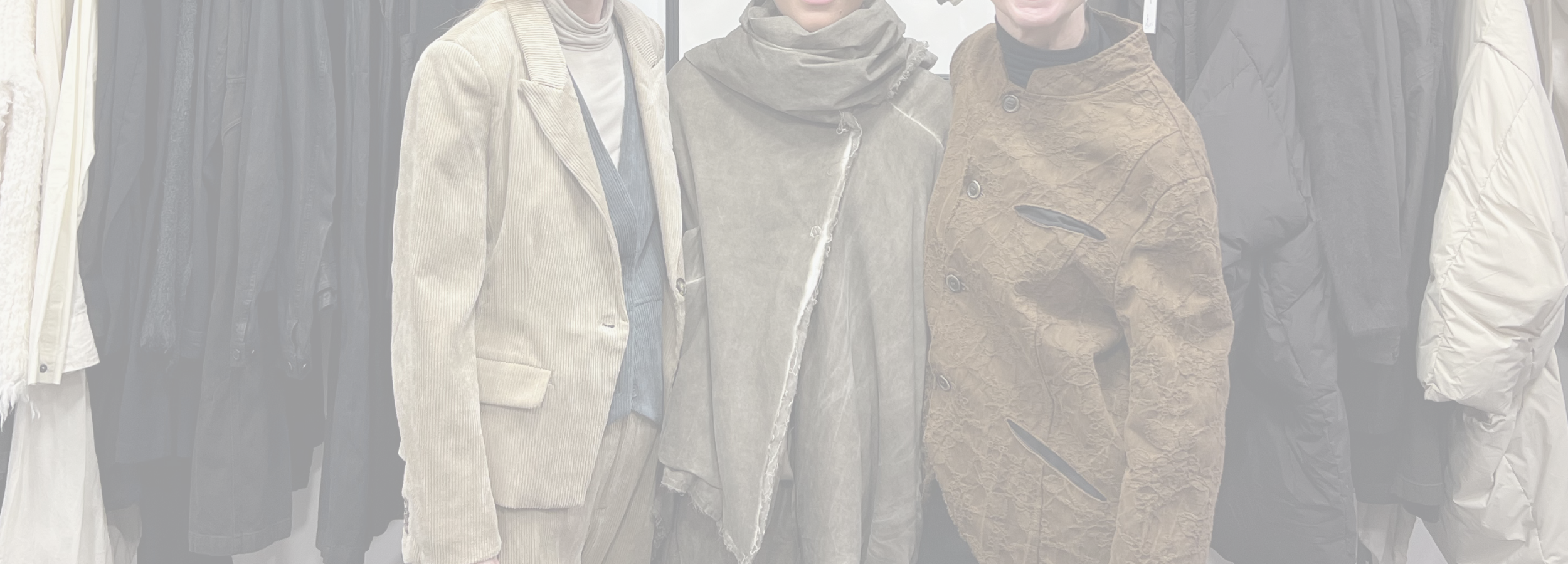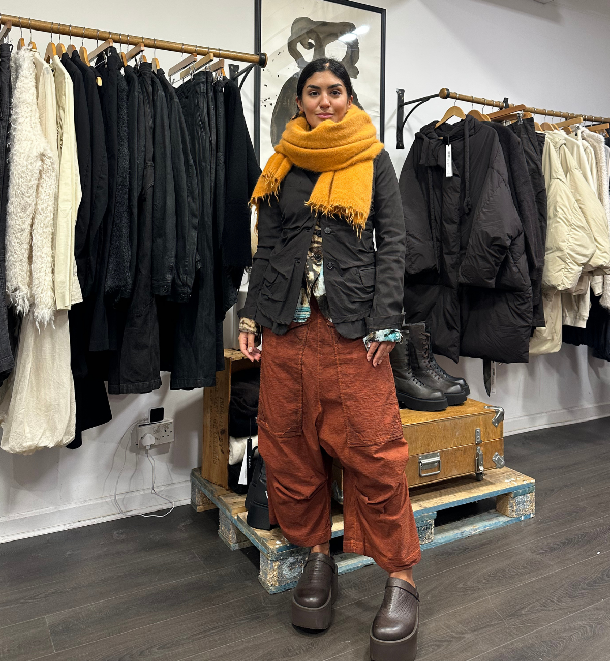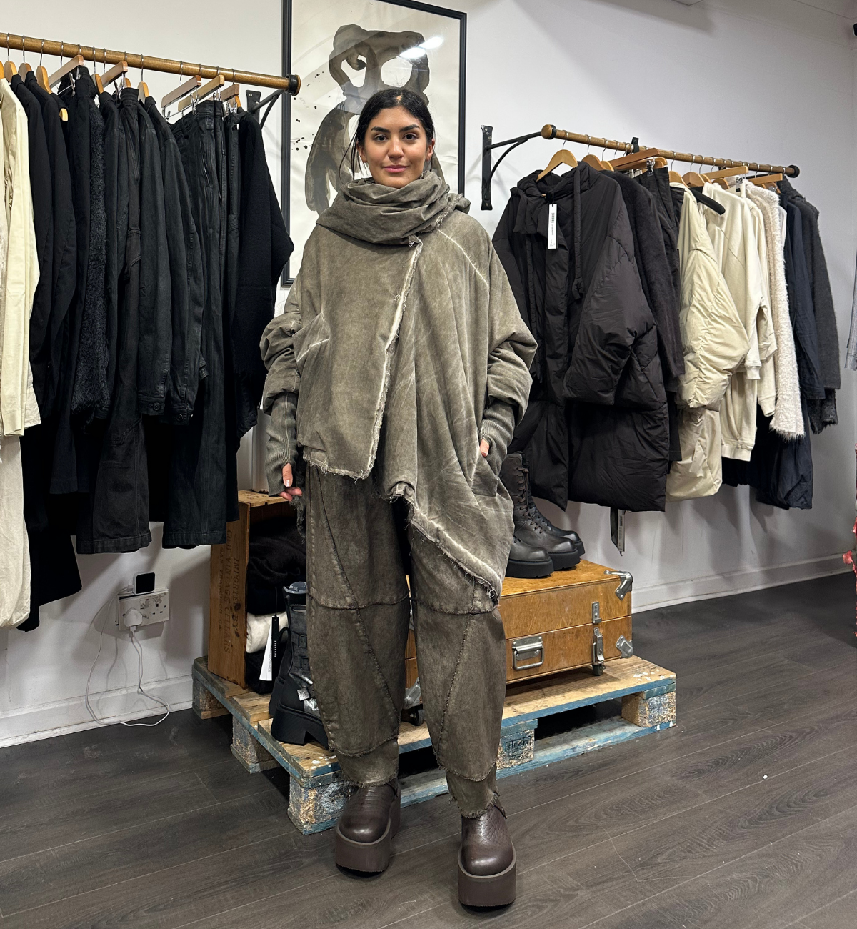 OUTFIT 3 - Yas wears the padded, asymmetric SANCTAMUERTE coat, with a co-ordinating balloon shaped Trouser. Distressed dyed seams add a touch of grunge.