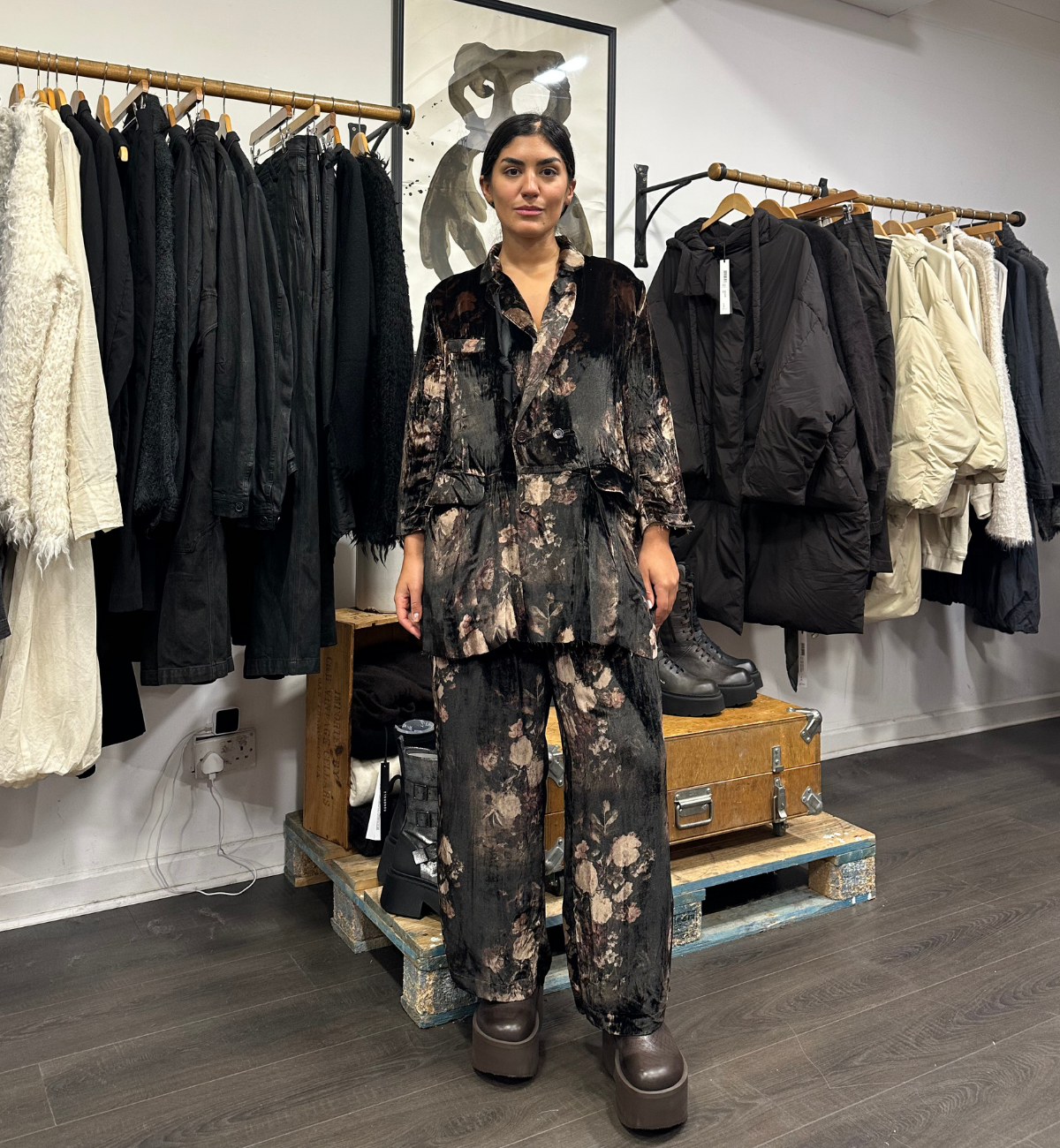 OUTFIT 1 - Yas styles the ALEKSANDR MANAMIS co-ordinating suit, showcasing the print of the season. Finished with the platform SORT AARHUS Mules, creating an effortless look.