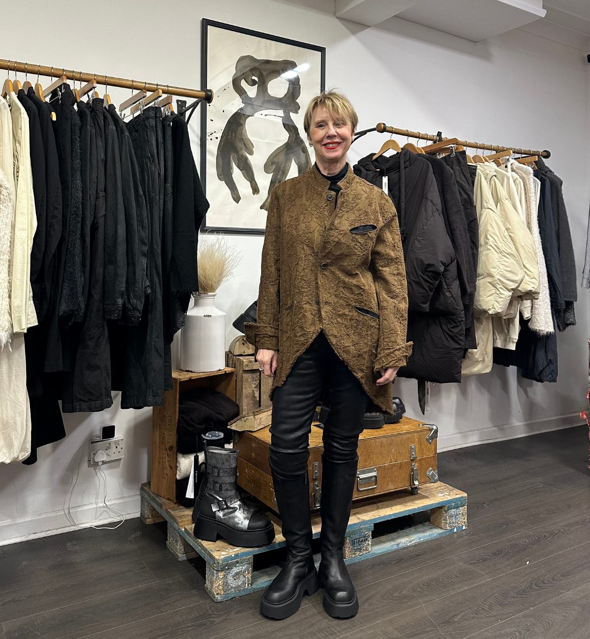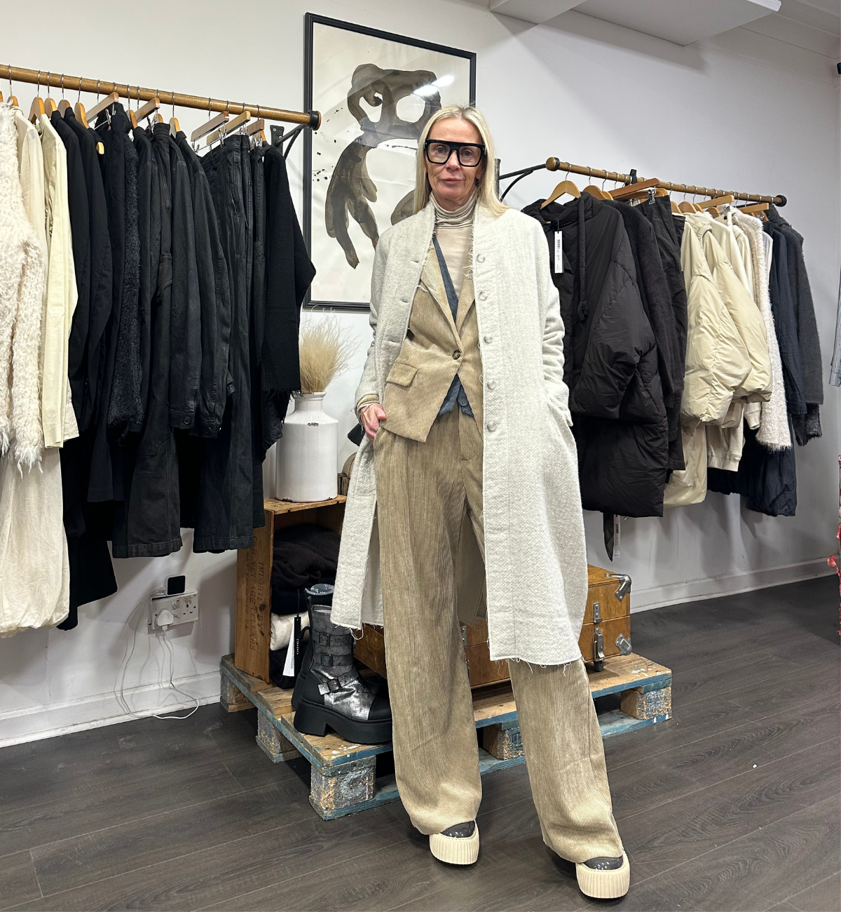 OUTFIT 2 - Liesa styles the Cord suit from MUNTHE, combining the Trouser, Jacket and Waistcoat for a polished look, finishing with a BAOBAB from MAMA B for an added layer.