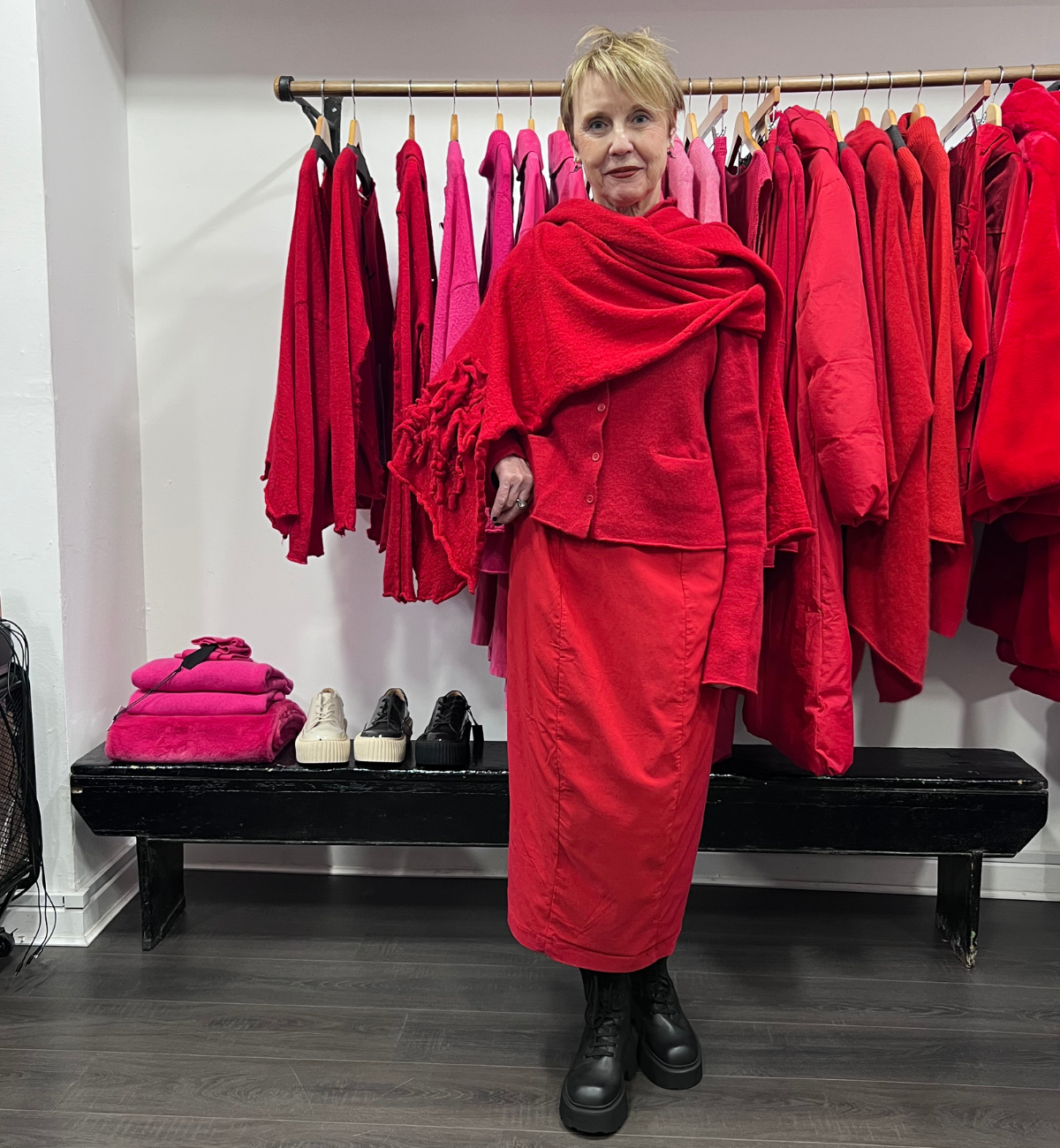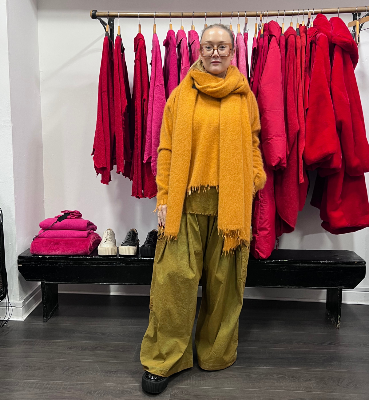 OUTFIT 2 - STYLING THE ROSE FROM RUNDHOLZ BLACK LABEL, PAULA WEARS THE CLASSIC TECHNO DRESS. LAYERED WITH A KNITTED CARDIGAN AND BOILED WOOL RUFFLED SCARF.