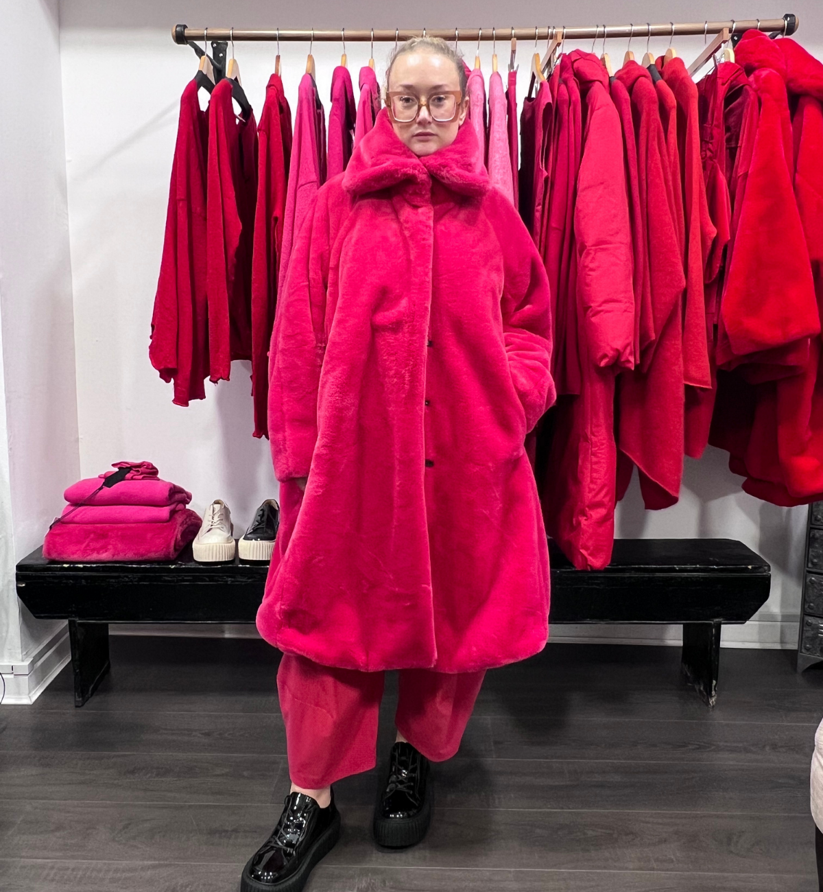 OUTFIT 1 - JADE COLOUR BLOCKS THE LOTUS FROM RUNDHOLZ BLACK LABEL. STARTING WITH THE STATEMENT LONGLINE FAUX FUR COAT, LAYERED OVER A STAPLE PULLOVER AND CHECK PRINT TROUSER. FINISHED WITH THE CLASSIC RUNDHOLZ MAINLINE PUMPS.