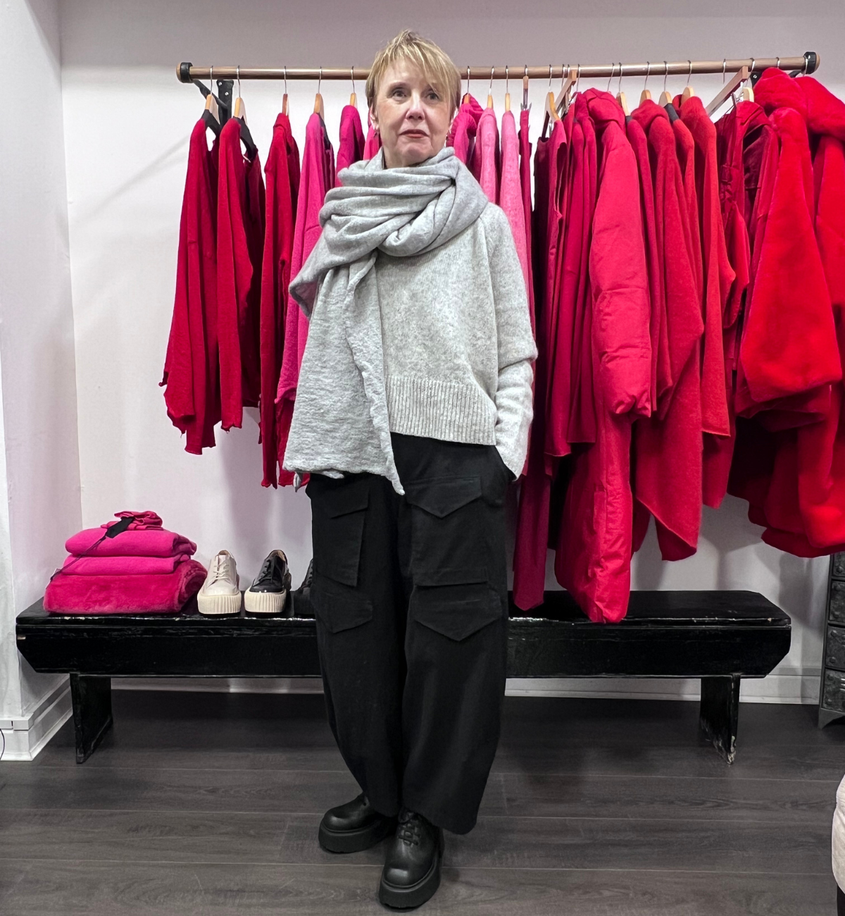 OUTFIT 1 - PAULA STYLES A GREY AND BLACK OUTFIT FROM RUNDHOLZ BLACK LABEL. INCORPORATING CLASSIC SHAPES AND STYLES, FINISHED WITH THE LACE UP BOOTS FROM SORT AARHUS.