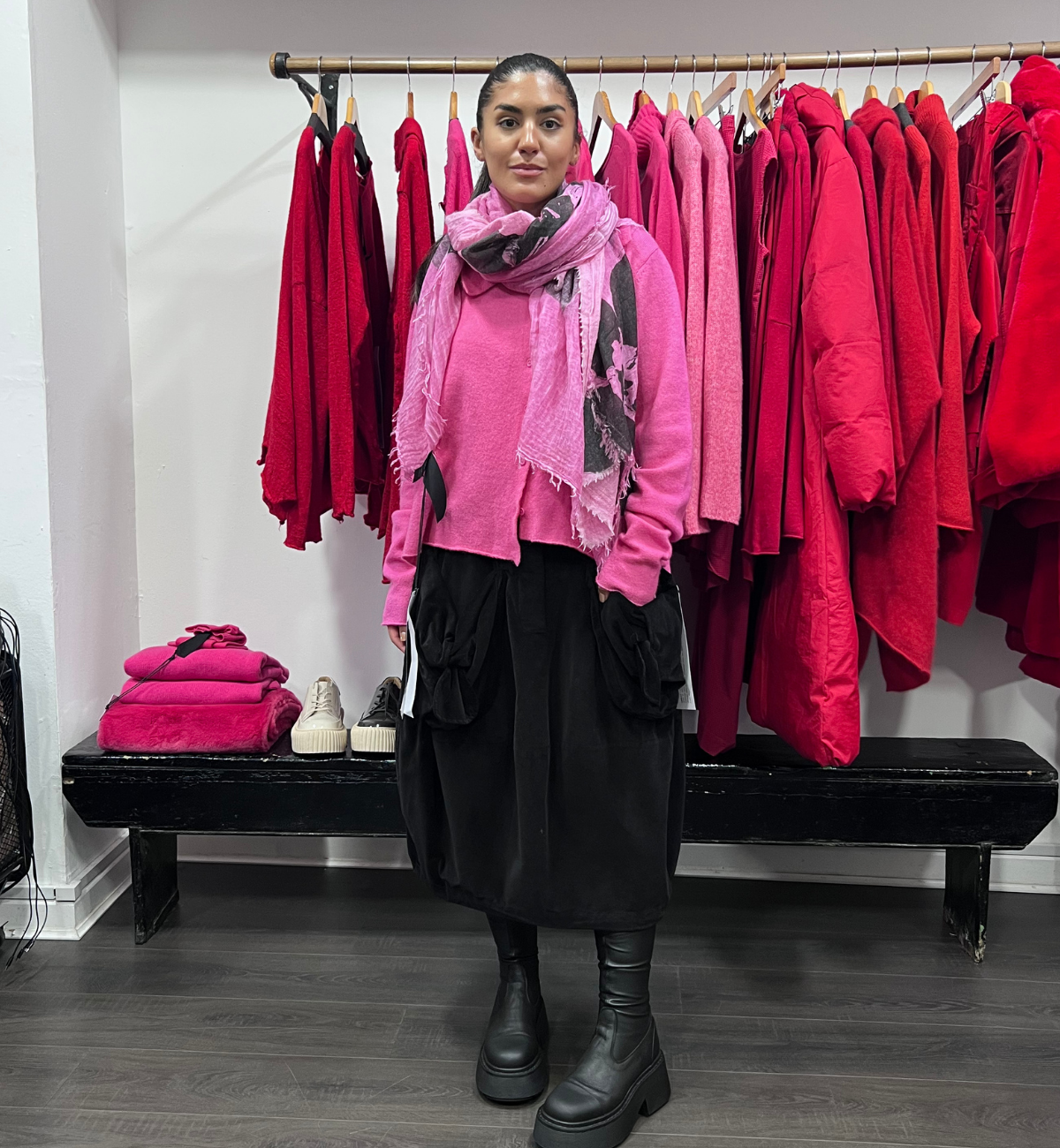 OUTFIT 2 - FOLLOWING THE PINK THEME, YAS STYLES A KNITTED CARDIGAN WITH A PRINTED SCARF, ADDING A VELVET SKIRT IN BLACK.