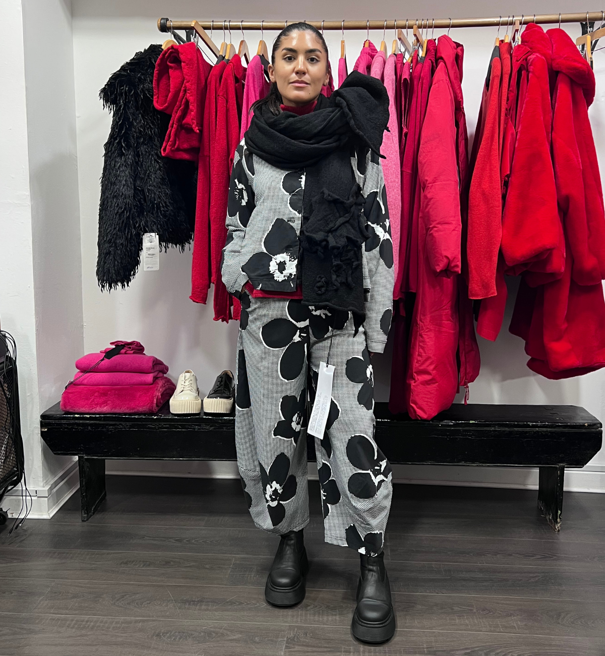 OUTFIT 3 - MIXING IT UP WITH THE PRINT OF THE SEASON FROM RUNDHOLZ BLACK LABEL, YAS CHOOSES A MATCHING JACKET AND TROUSER SUIT. SPLITTING UP THE PRINT WITH ROSE AND BLACK.