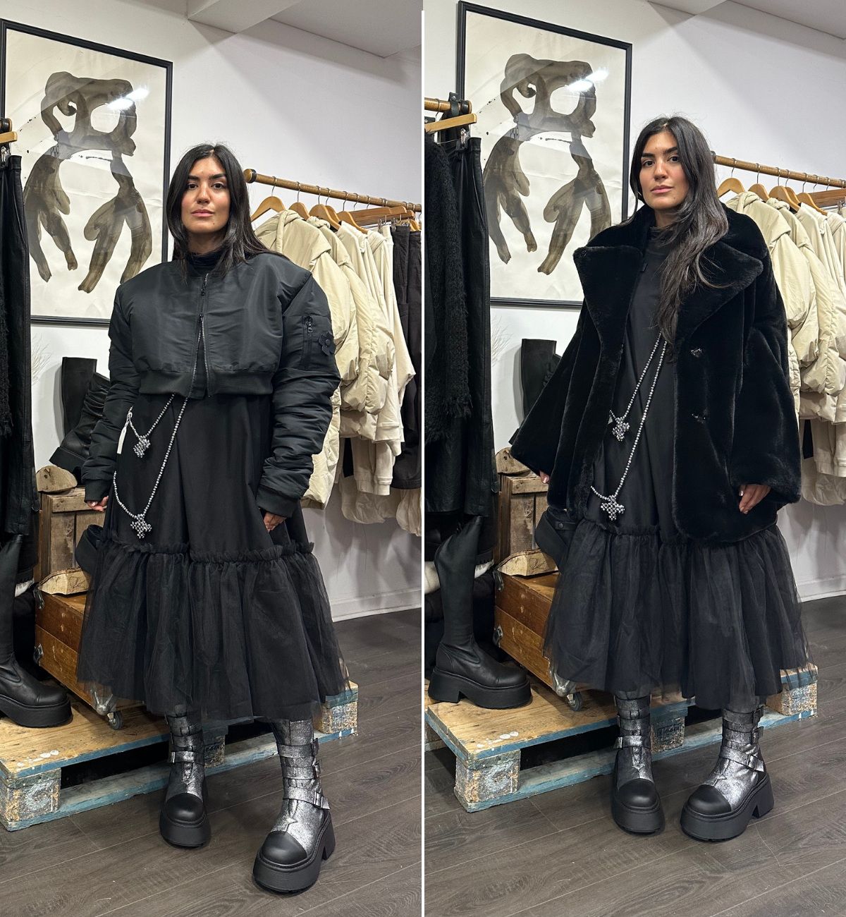 YAS STYLES A PARTY INSPIRED OUTFIT FROM PLU! FEATURING THEIR MESH DRESS, CLASSIC CROPPED BOMBER JACKET AND SOME OF THEIR NEW JEWELLERY. FINISHED WITH THE SPARKLY SORT AARHUS BOOTS! AS AN ALTERNATIVE LOOK, THE RUNDHOLZ BLACK LABEL FAUX FUR JACKET.