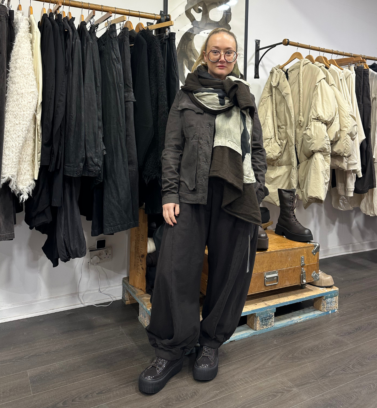JADE STYLES A FULL TURF OUTFIT FROM RUNDHOLZ MAINLINE. COMBINING A FITTED JACKET STYLE WITH THE JERSEY TROUSER. FINISHED WITH THE WOOL-BACKED SCARF IN THE 1/2 SHARER SIZE.