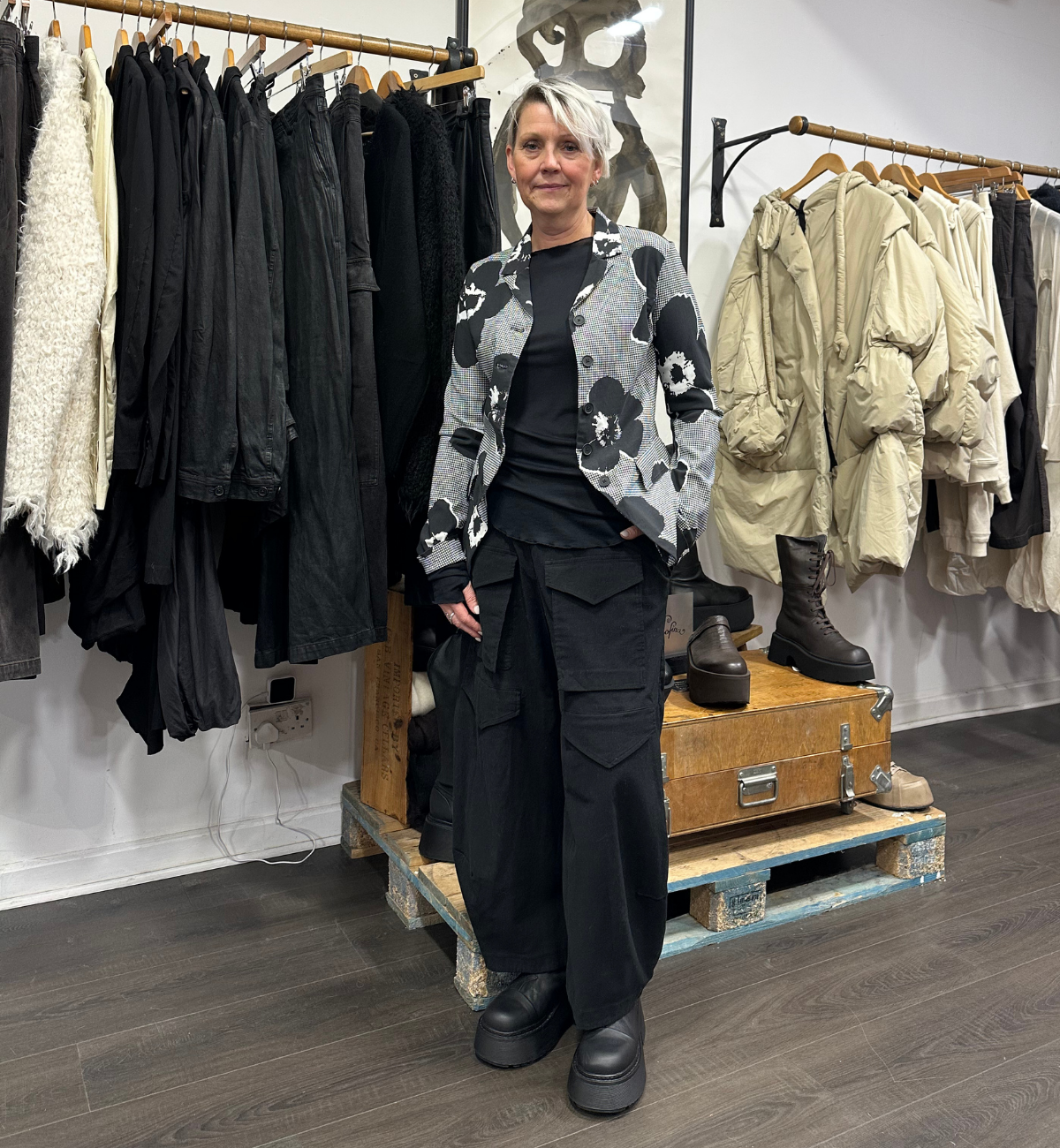 KIRSTIE STYLES THE RUNDHOLZ BLACK LABEL, INCORPORATING THE PRINT OF THE SEASON IN THE MONOCHROME COLOURWAY. THE TROUSERS ARE IN A COMBAT, UTILITARIAN STYLE AND SHE FINISHES THE OUTFIT OFF WITH THE BUCKLED BOOTS FROM SORT AARHUS.