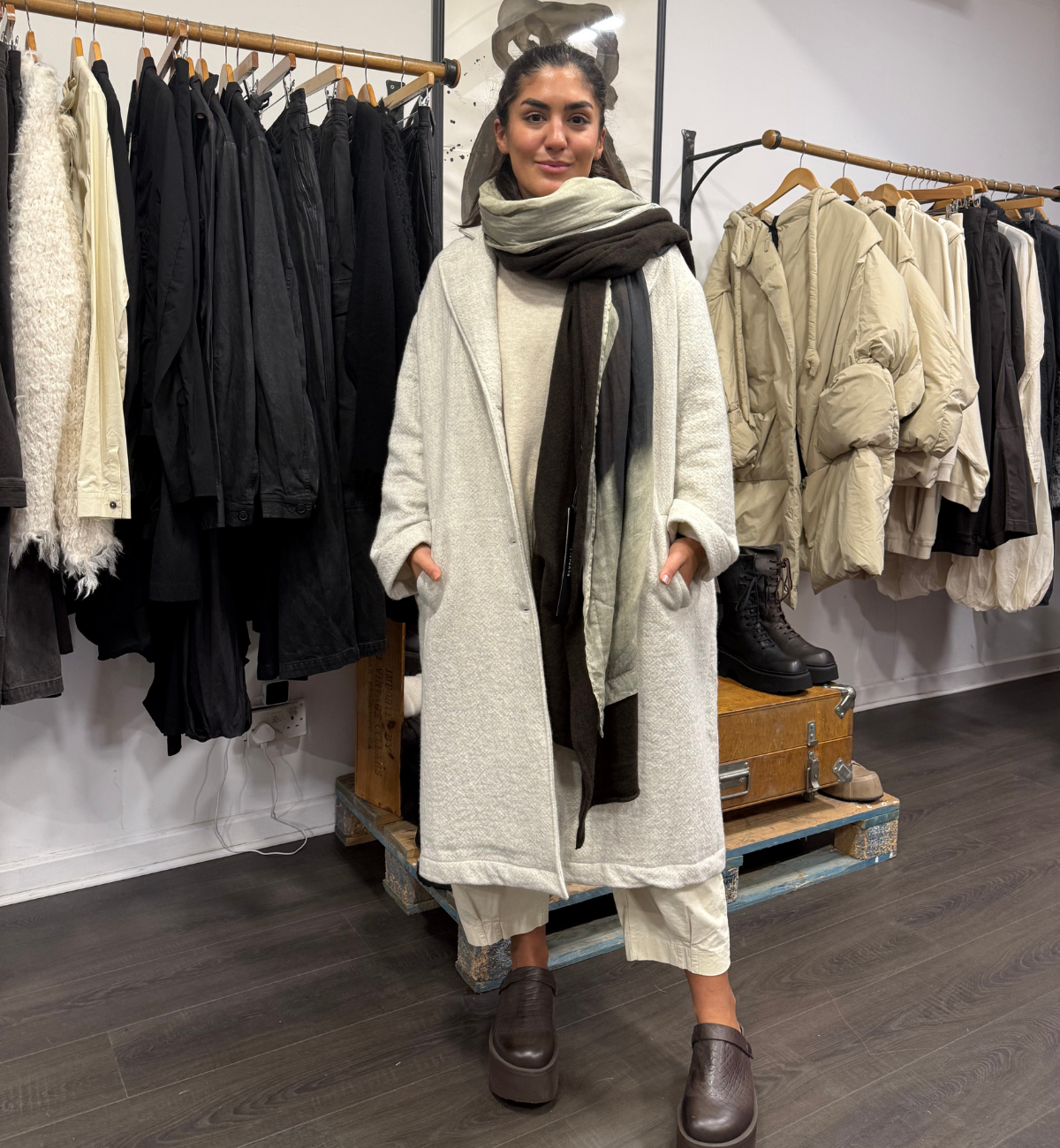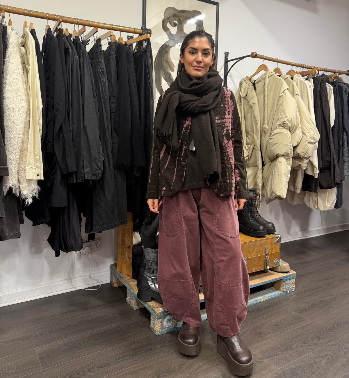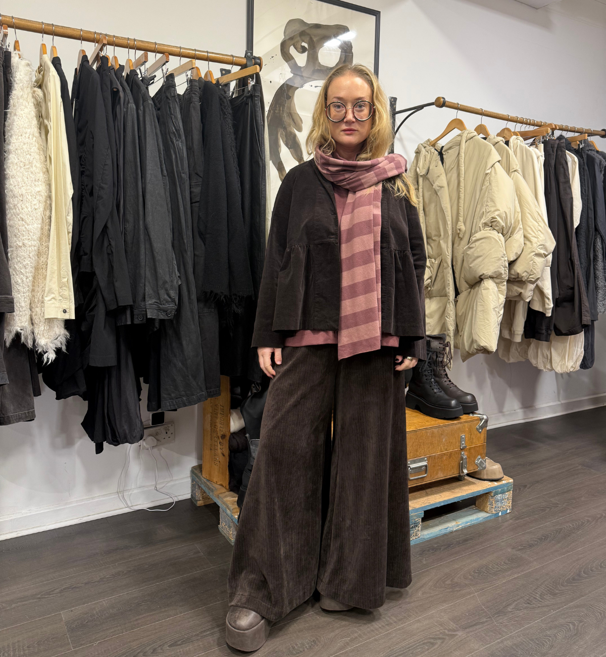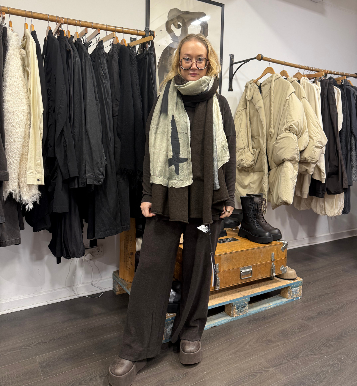 OUTFIT 1 - STYLING UP MORO AND CIPOLLA, JADE MASHES UP SOME OF HER FAVOURITE PIECES FROM THE MAMA B COLLECTION IN THIS LOOK. SHE WEARS THE VELOCE L JACKET WITH THE NUCCIA WIDE LEG STYLE TROUSER, FINISHING THE OUTFIT OFF WITH A SEGOVIA SCARF AND DINA PULLOVER.
