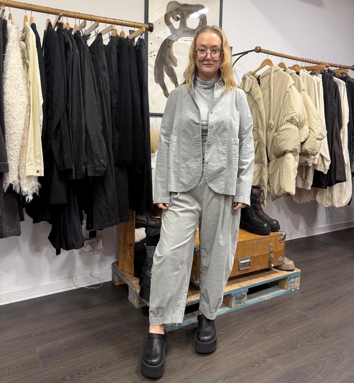 OUTFIT 3 - JADE NOW VENTURES INTO THE NEBBIA COLOURWAY FROM MAMA B. SHE STYLES UP THE CO-ORD OF THE SEASON, THE CIMONE L JACKET AND THE BIANCO V TROUSER, FINISHING IT OFF WITH A BAOBAB T-SHIRT.