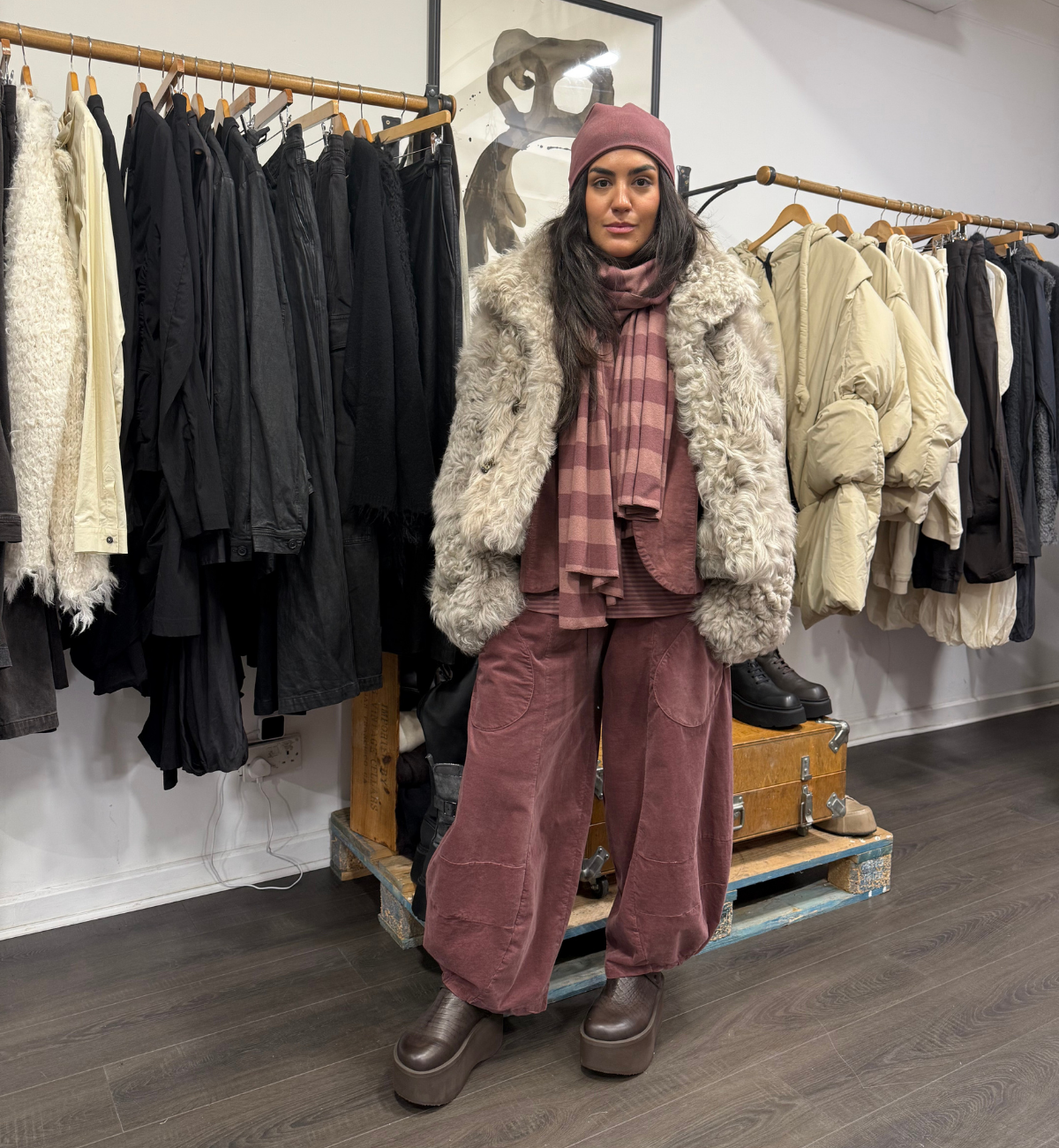 OUTFIT 1 - YAS STARTS IN A FULL CIPOLLA OUTFIT FROM MAMA B. SHE LAYERS THE DOM GOOR SHEARLING JACKET FOR AN ADDED BIT OF WARMTH AND STYLE. SHE PAIRS THE PACE V TROUSER WITH THE CIMONE L JACKET, FINISHING THE OUTFIT OFF WITH A KIRA PULLOVER, MEMI MR TOP AND SEGOVIA SCARF.
