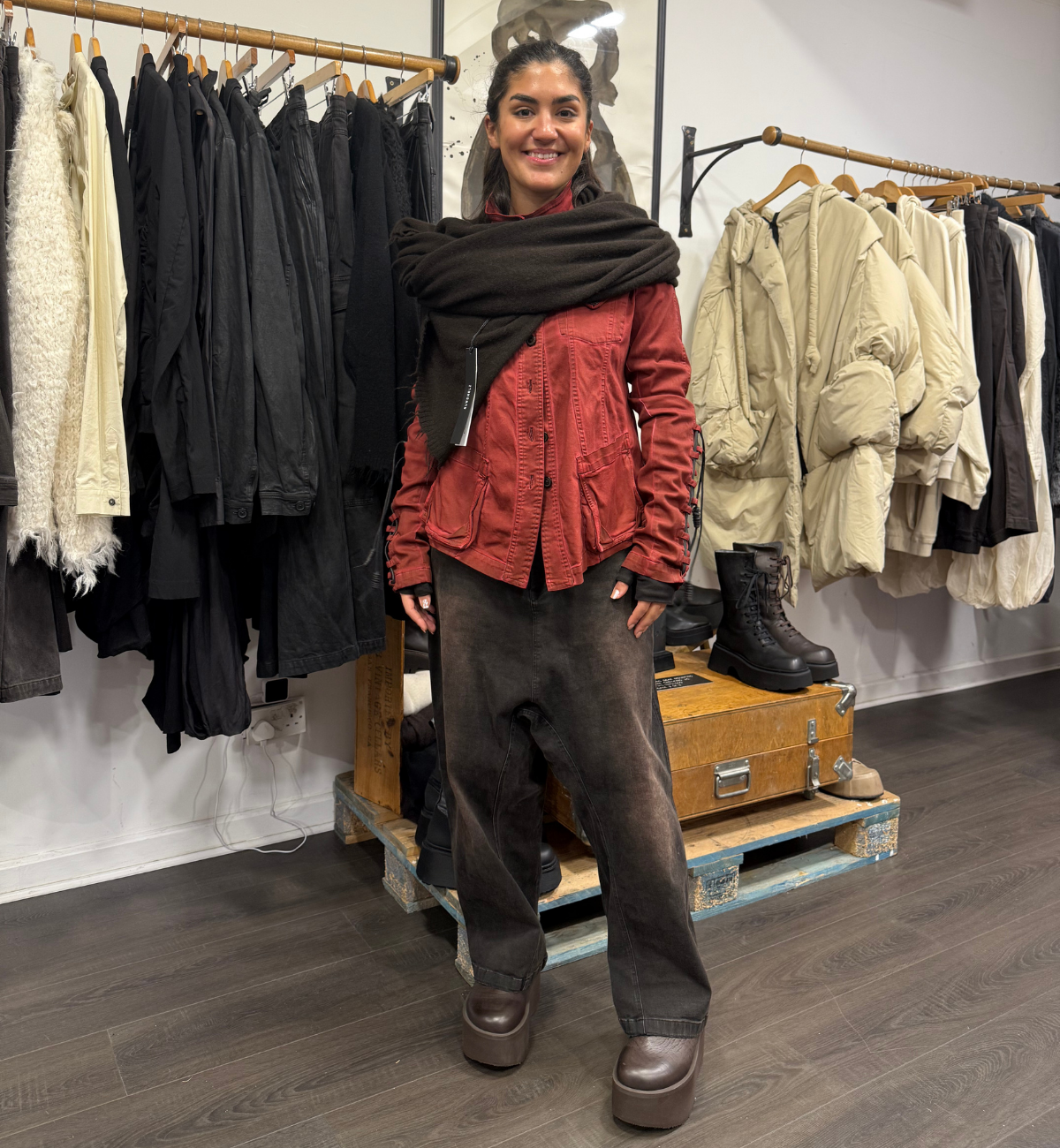 OUTFIT 4 - A SPECIAL DELIVERY FROM RUNDHOLZ ARRIVED! YAS SHOWCASES THE NEW IN SHAPE, PAIRING IT UP WITH A MAINLINE RACOON PULLOVER AND DIP DENIM JACKET IN CRAB TO SHOW THE VERSATILITY OF THE STYLE.