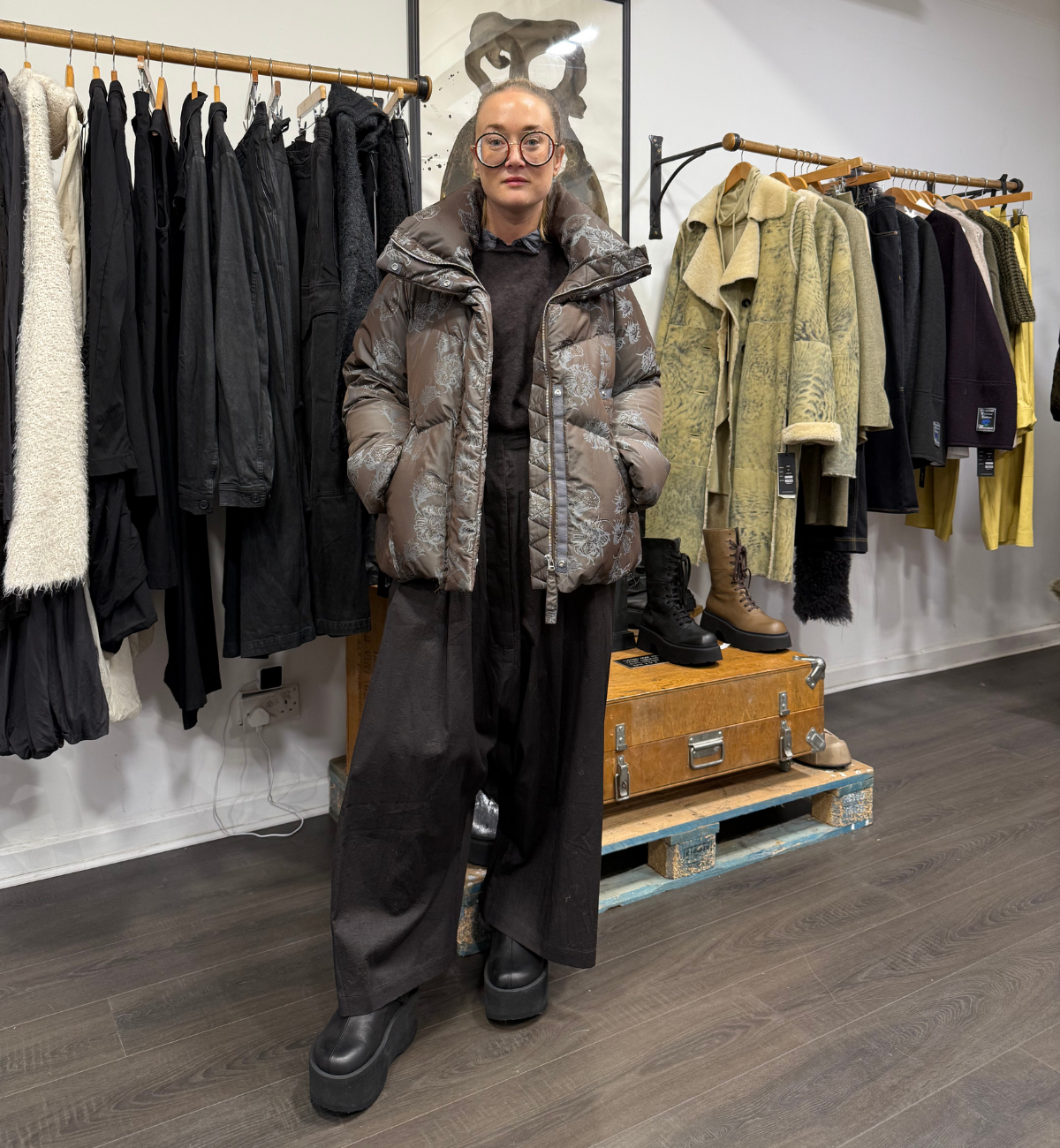 JADE PAIRS UP SOME RUNDHOLZ MAINLINE TURF AND FLAMINGO FROM RUNDHOLZ DIP WITH THE STATEMENT ANNETTE GÖRTZ AMO PUFFER JACKET. SHE WEARS THE WIDE LEG TROUSERS FROM MAINLINE WITH THE RACOON PULLOVER AND CUPRO SHIRT FOR A LAYERED LOOK.
