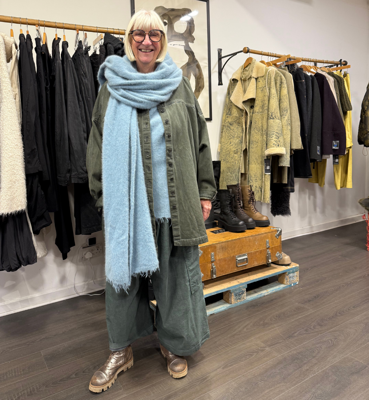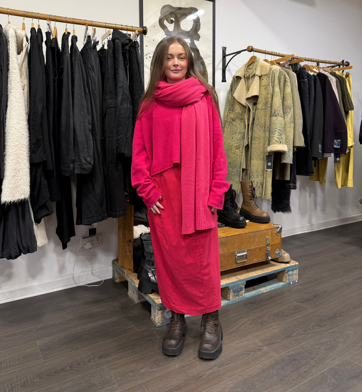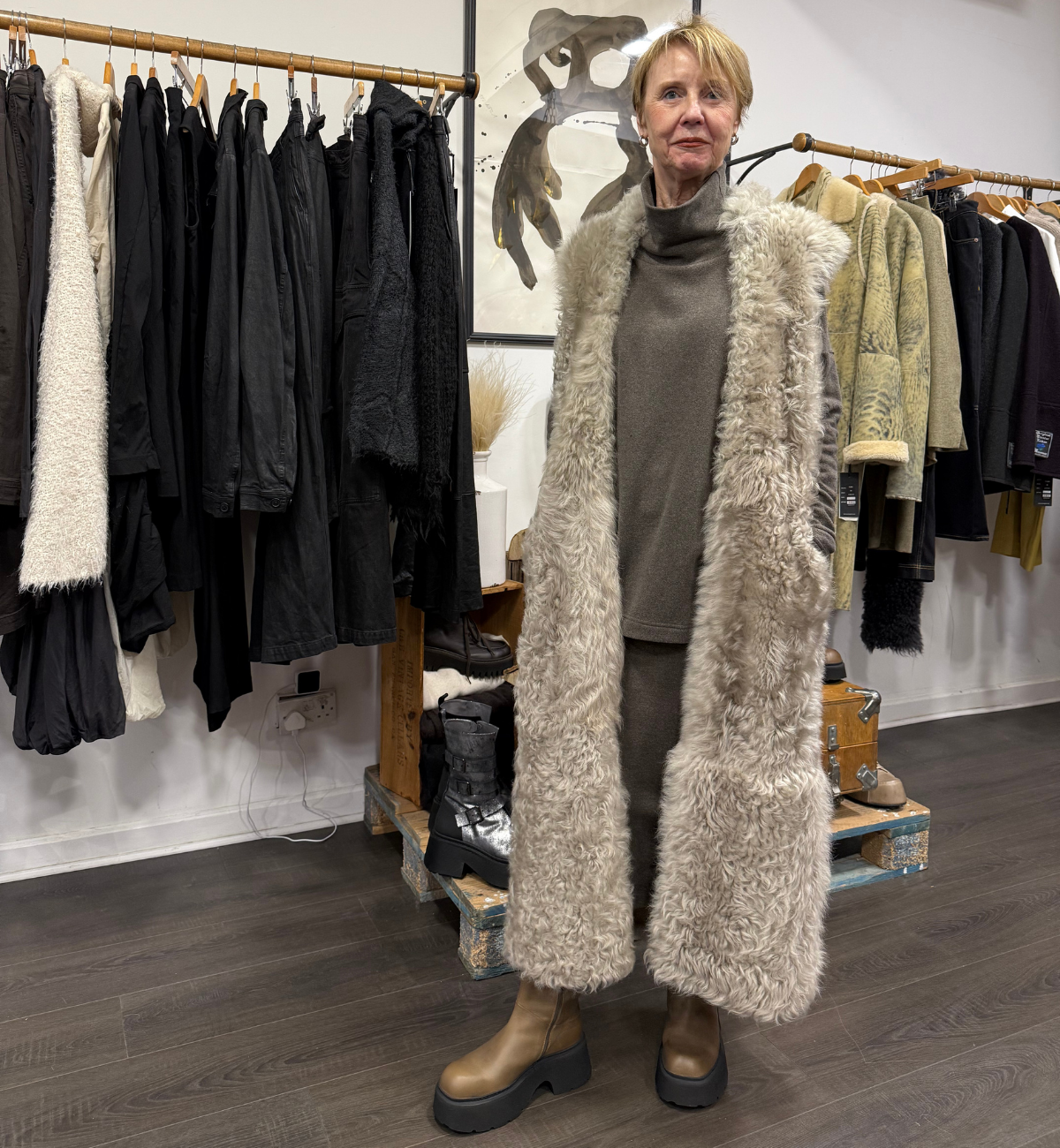 EMBRACING MAMA B, PAULA MASHES SOME PIECES UP WITH THE LUXURIOUS DOM GOOR SHEARLING GILET. SHE WEARS THE ZITA PULLOVER WITH THE LILLA SKIRT IN THE RINDE COLOUR AND FINISHES IT OFF WITH SOME SORT AARHUS BOOT.