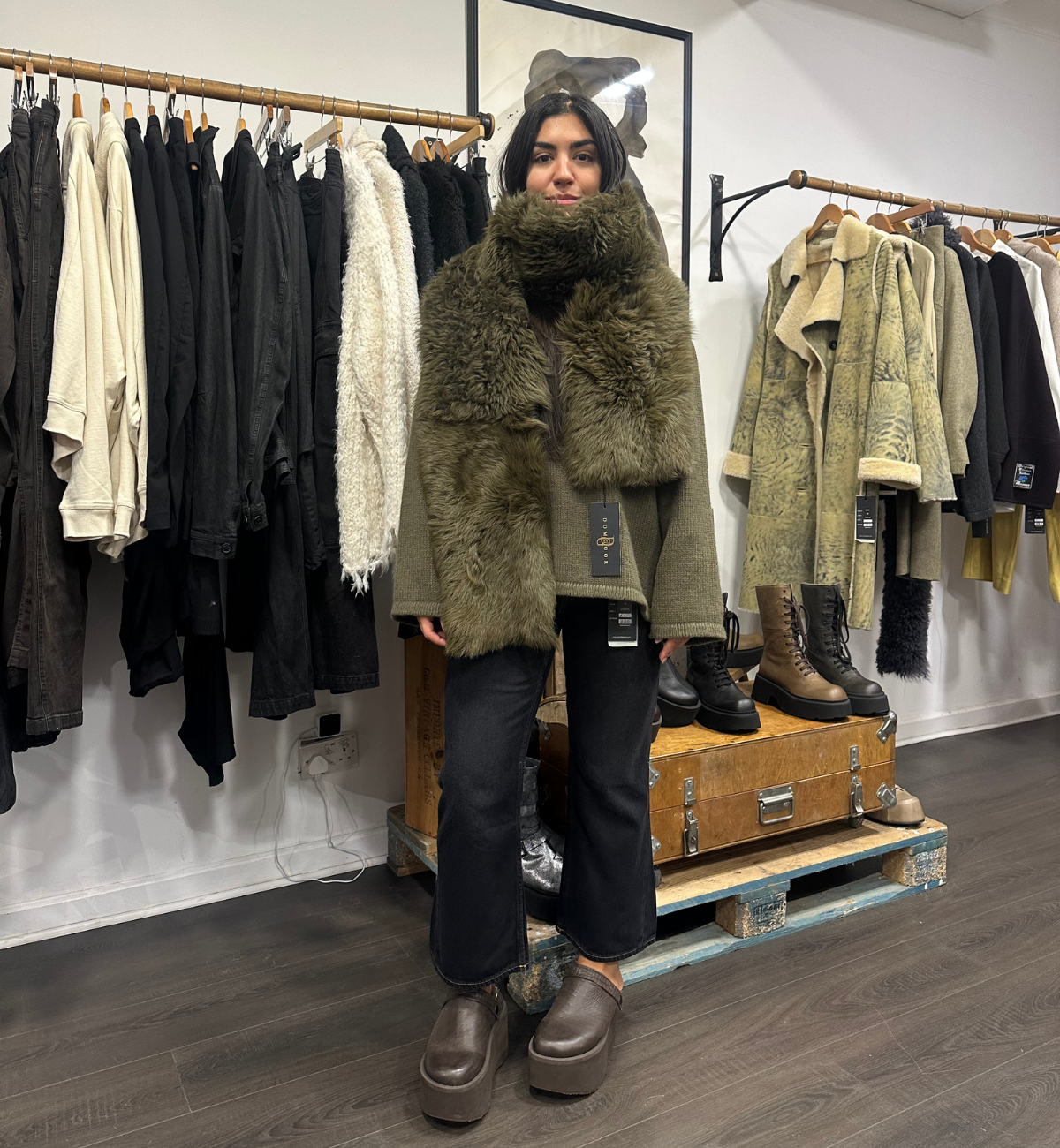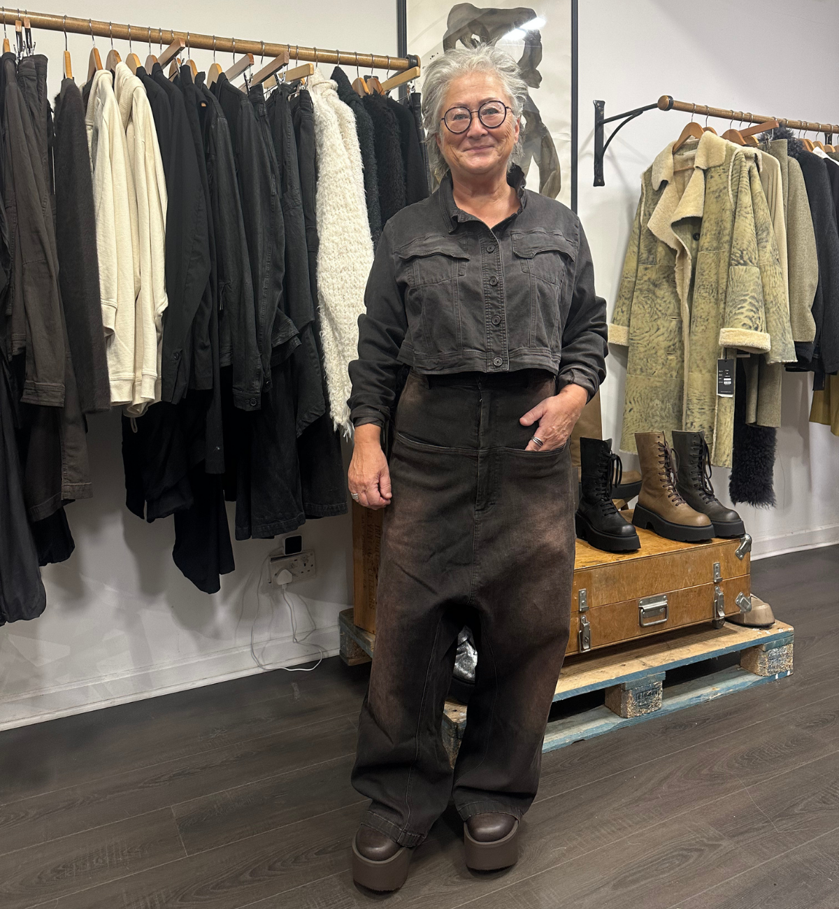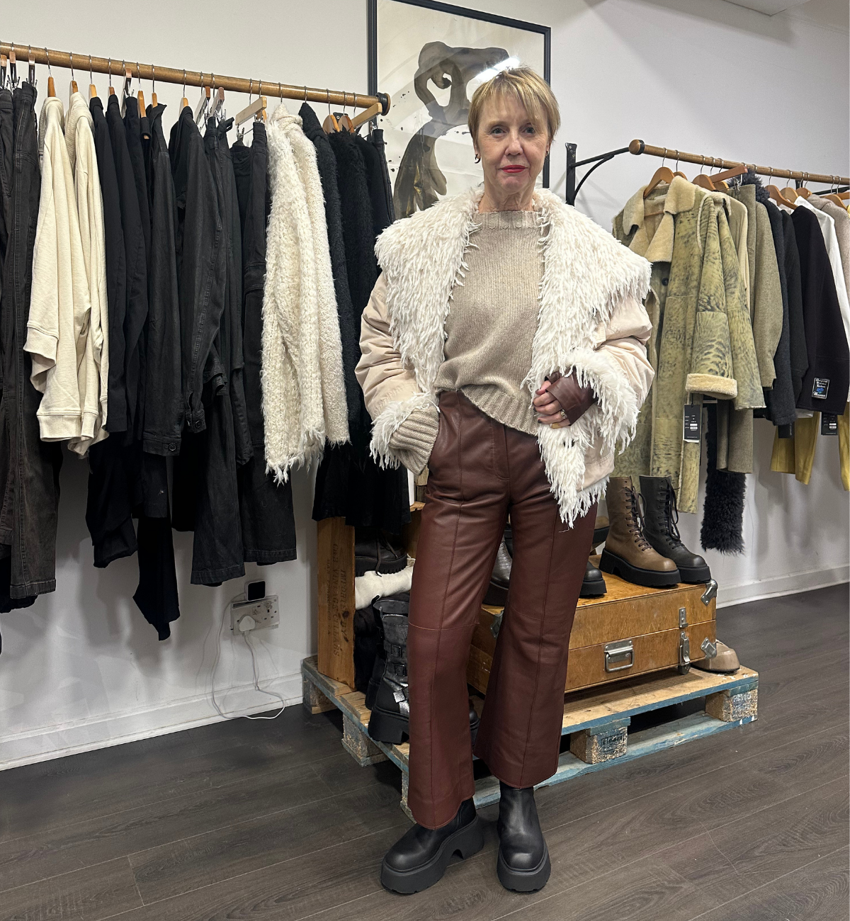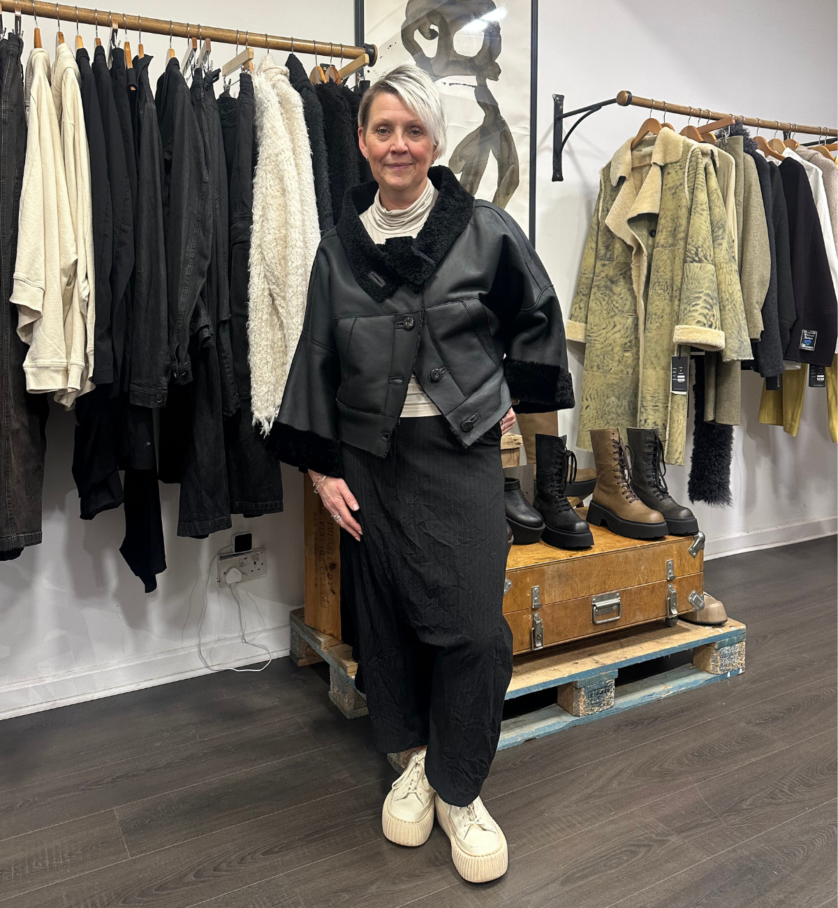 KIRSTIE STYLES A MIXTURE OF ANNETTE GÖRTZ WITH SORT AARHUS. SHE PAIRS UP THE CALO FUR JACKET WITH THE SORT AARHUS DROP CROTCH TROUSER IN A SUBTLE PINSTRIPE DESIGN.