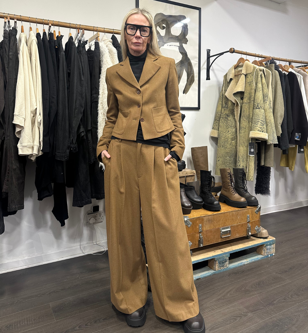 LIESA STYLES UP HER FAVOURITE CO-ORD OF THE SEASON FROM SORT AARHUS IN THE CAMEL COLOUR. SHE FINISHES THE LOOK OFF WITH A BASIC TOP AND SOME SORT AARHUS LACE UP BOOTS.
