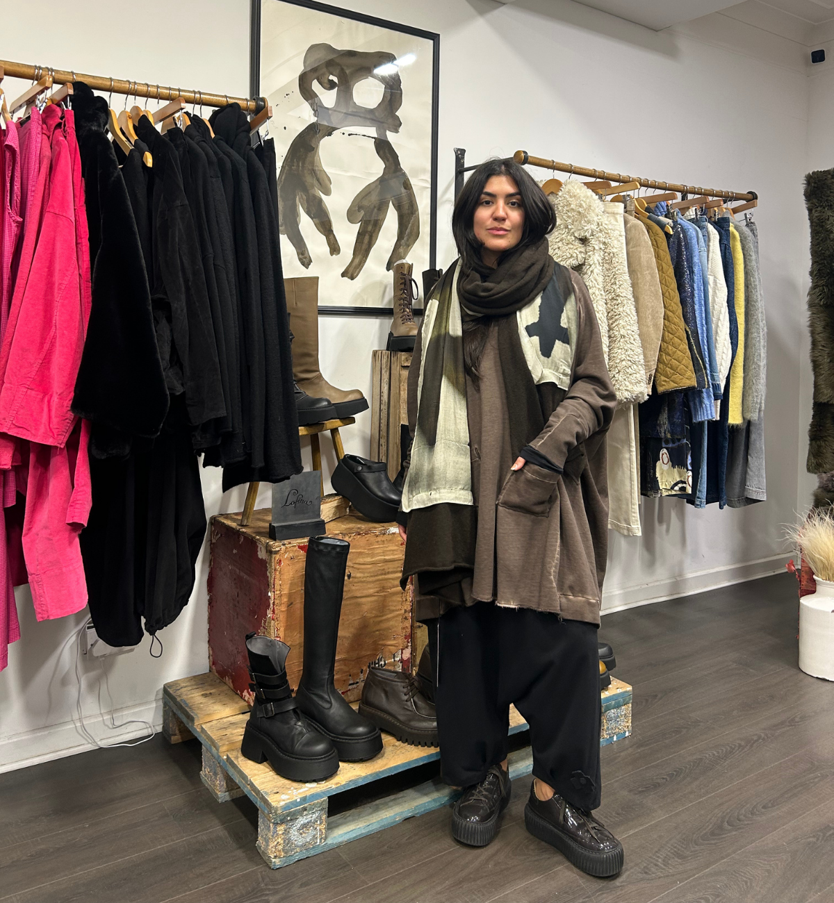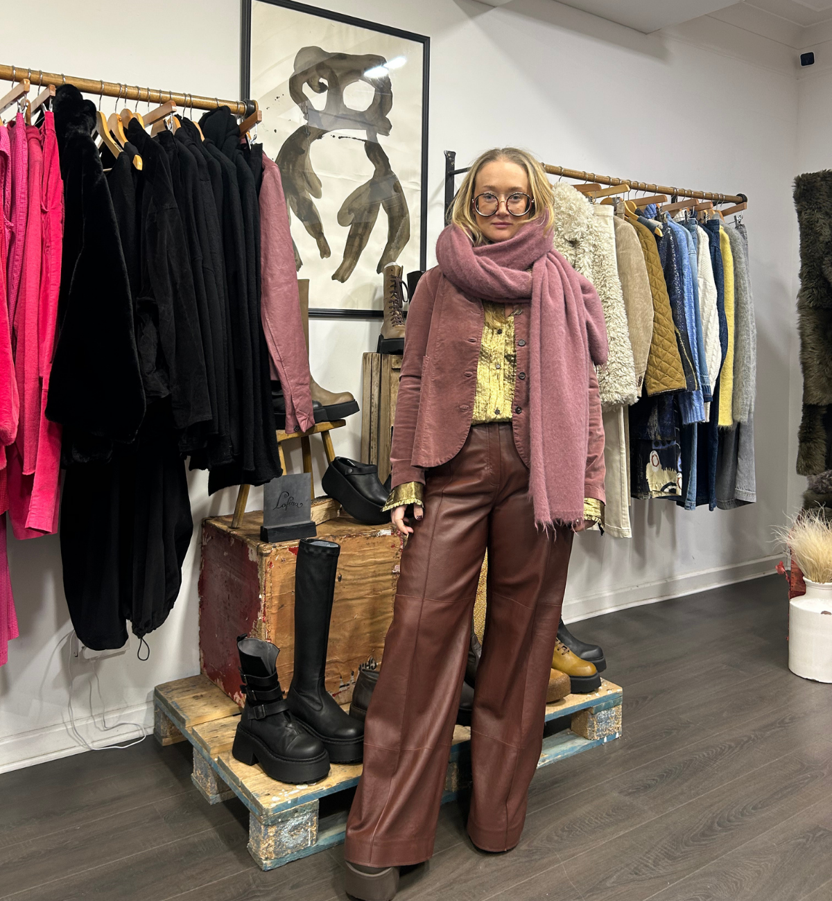OUTFIT 1 : LIESA MASHES UP THE PRE-LOVED RUNDHOLZ MAINLINE COAT WIT THE MANUELLE GUIBAL SCARF & PULLOVER, FINISHED WITH THE CULT-FAVOURITE AEQUAMENTE TROUSER.