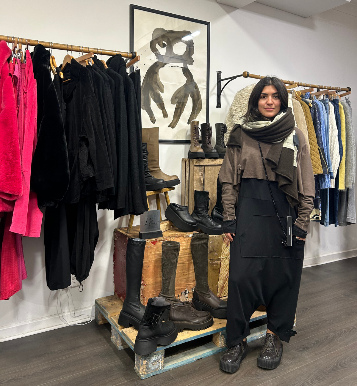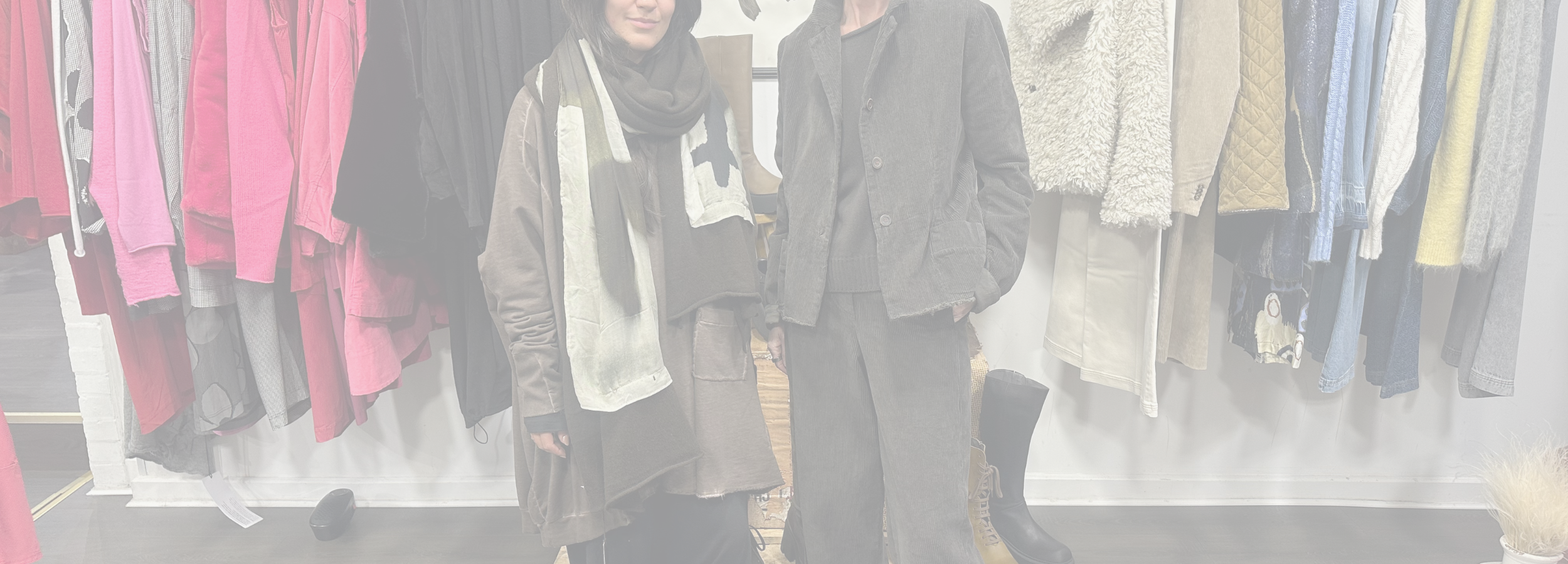 OUTFIT 2 : LAYERING THE PLU JACKETS WITH A SCULPTURAL TURF SCARF FROM RUNDHOLZ MAINLINE, CREATING A BOLD TEXTURAL LOOK.