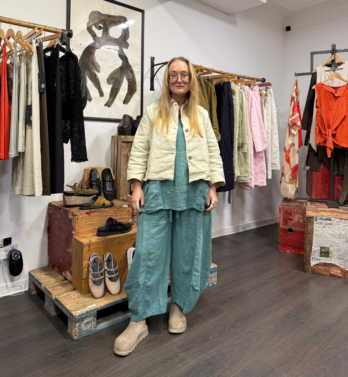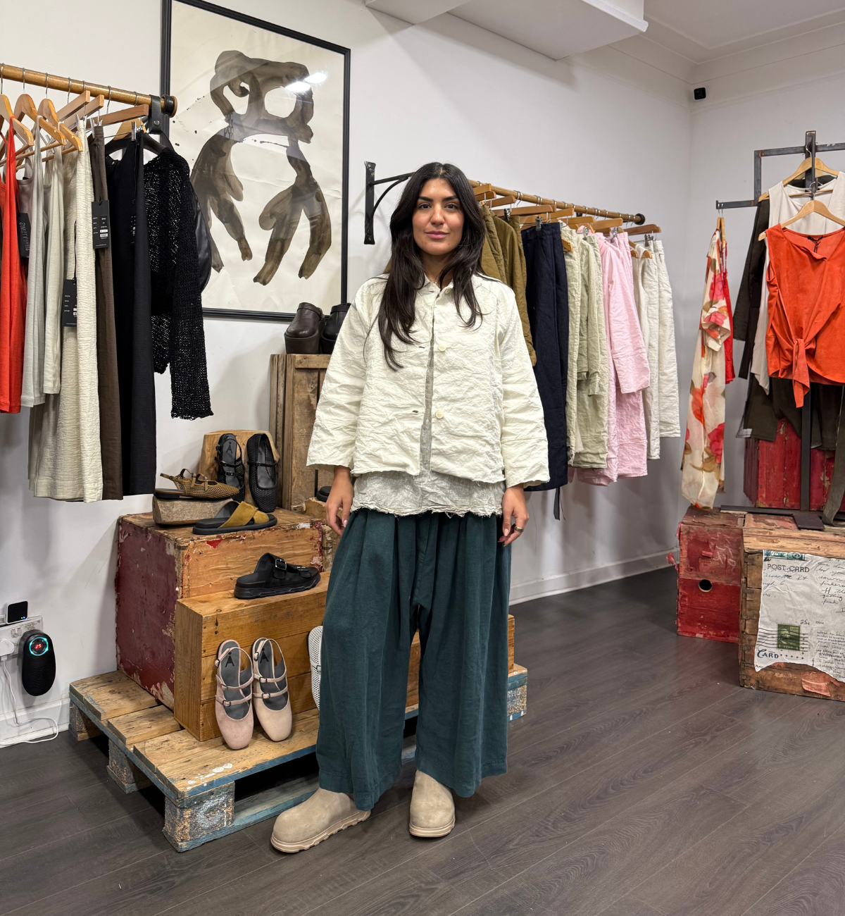 Styling up the balloon shaped Linen trouser, Jade pairs them with the co-ordinating sleeveless top layered with the AEQUAMENTE Jacket in the sand colour.