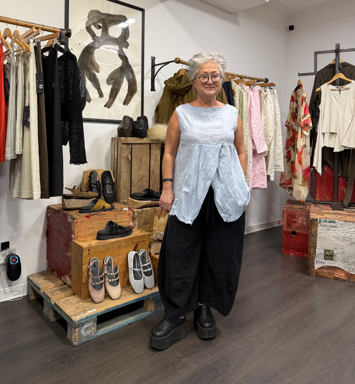 OUTFIT 2 - SHOWCASING THE SKY FOG COLOUR FROM DIP, VAL STYLES UP THE SLEEVELESS TOP WITH THE BUTTON-UP SHIRT LAYERED OVER.
