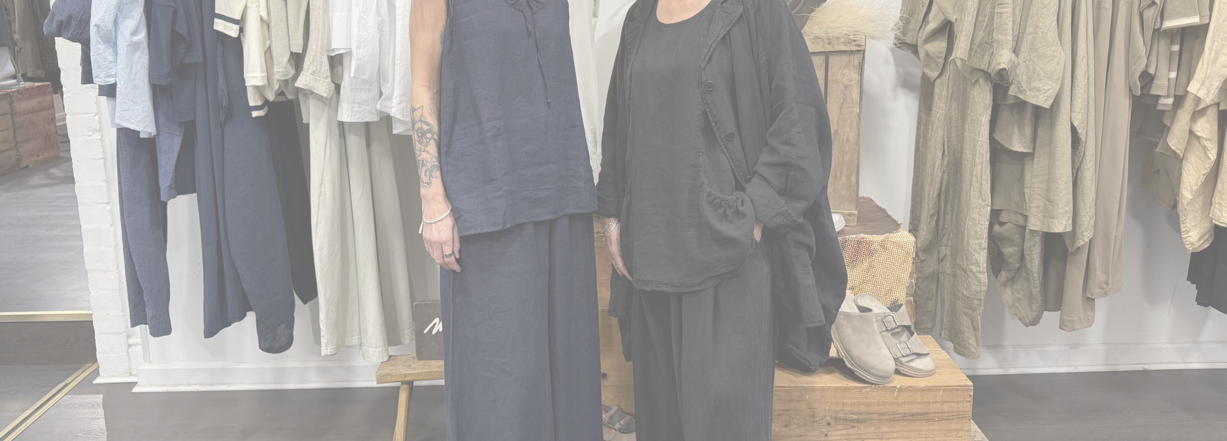 OUTFIT 4 - STYLING THE TREE COLOURWAY, LIESA PAIRS THE LINEN DRESS WITH THE BALLOON LEG TROUSER.