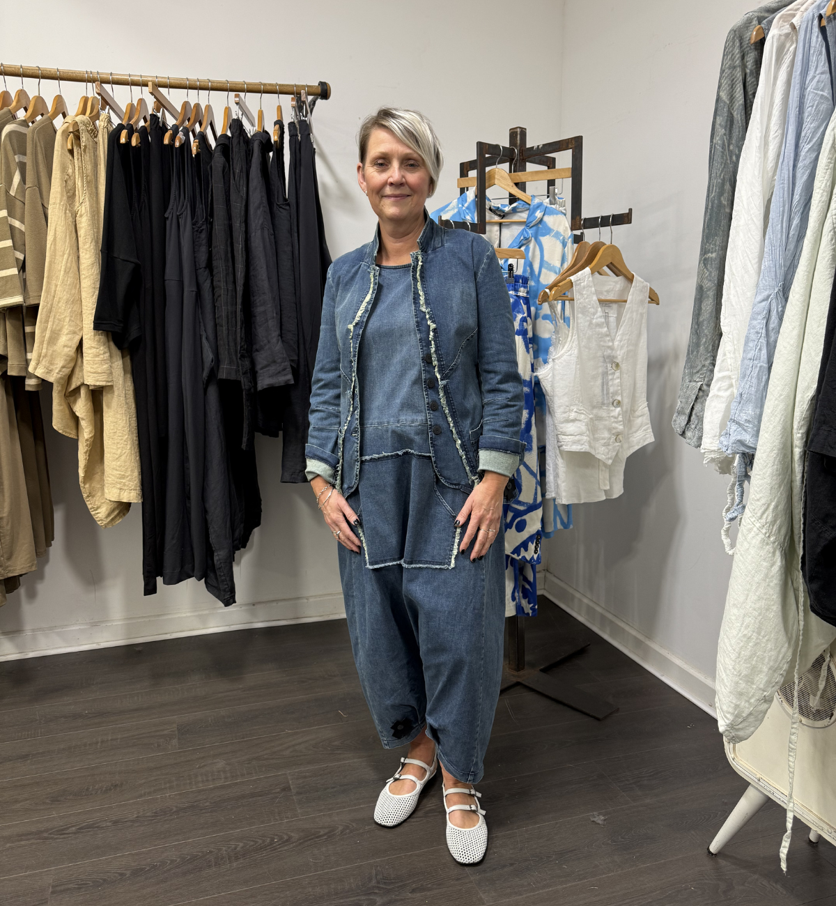 OUTFIT 1 - KIRSTIE REACHES FOR THE STRETCH DENIM FROM PLU. STYLING UP THE JACKET AND OVERALL AND FINISHING THE OUTFIT OFF WITH THE SORT ARRHUS SHOE.