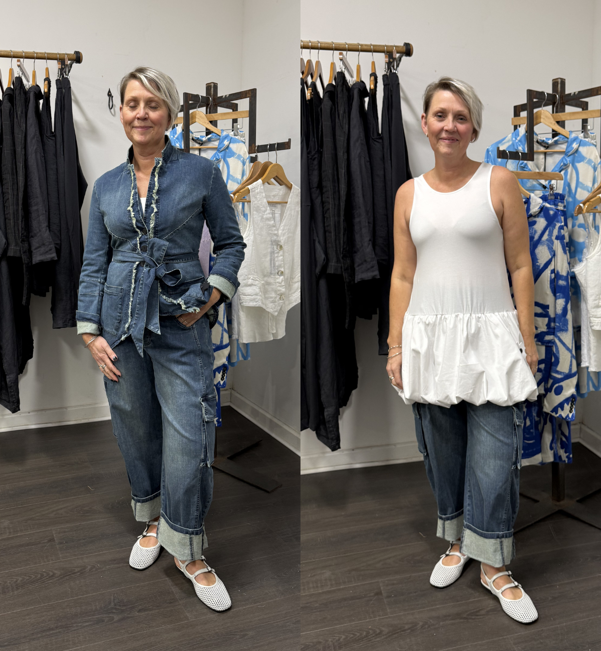 OUTFIT 3 - LIESA SHOWS OFF THE STATEMENT PUFF STYLE TUNIC FOR HER NEXT LOOK.