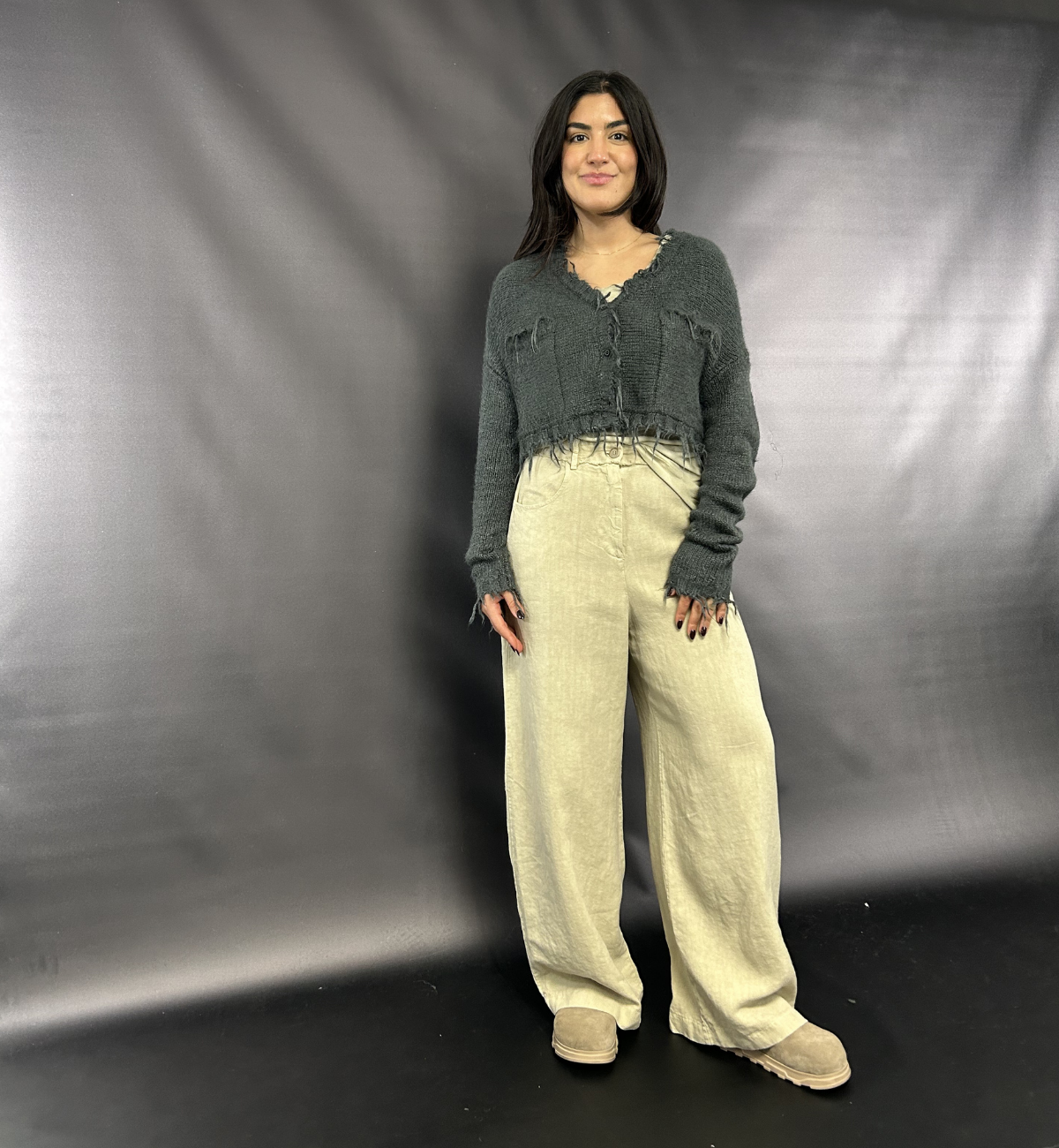 OUTFIT 3 - YAS SHOWS THE FULL SILK DISTRESSED CARDIGAN IN THE SEAWEED COLOUR.
