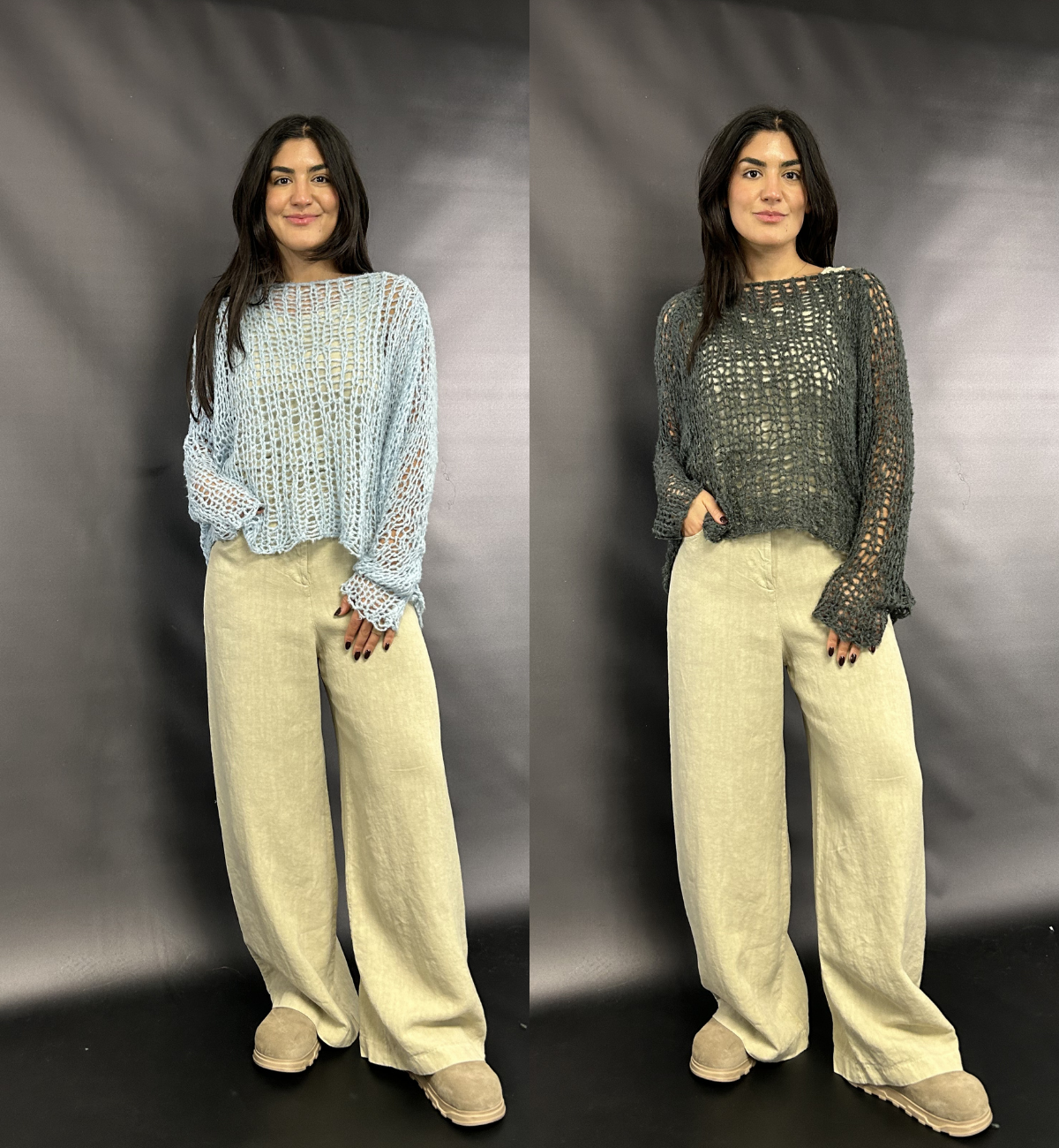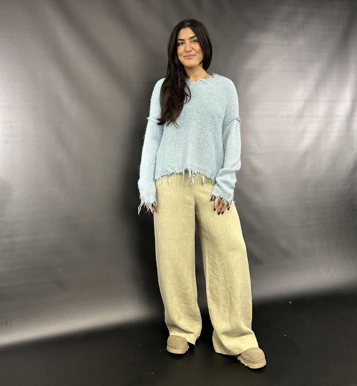 OUTFIT 2 - YAS SHOWS OFF THE OTHER COLOURS IN THE LOOSE WEAVE KNIT. SHE FEATURES THE SEAWEED AND SKY, SHOWING HOW THE COLOURS CAN CHANGE UP AN OUTFIT IN AN INSTANT.