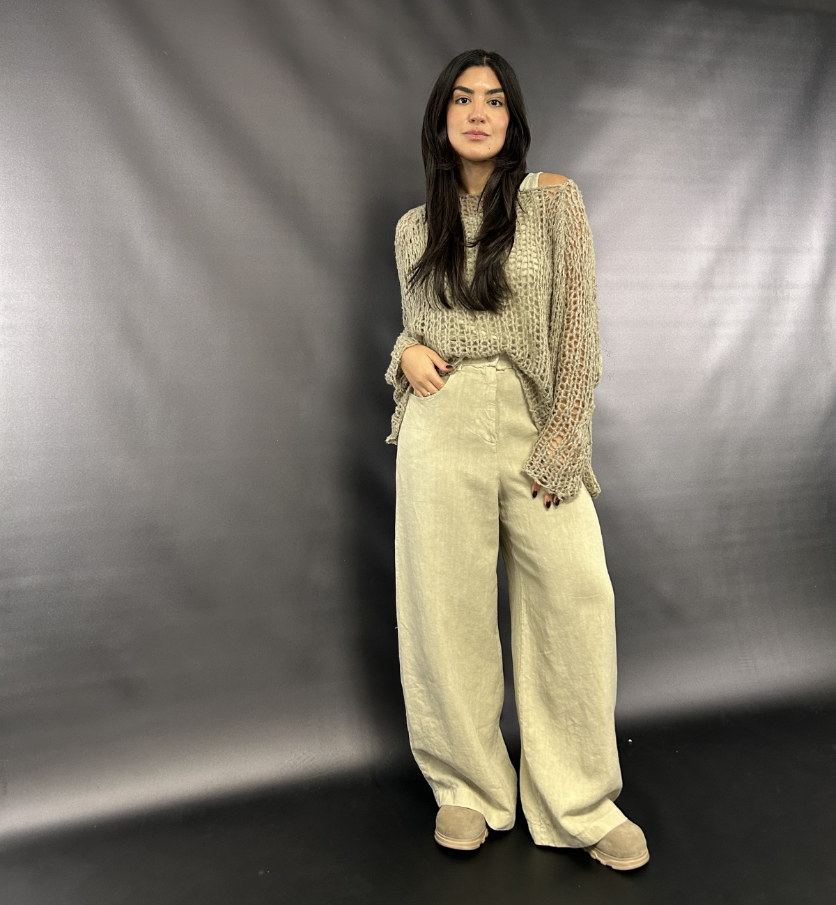 OUTFIT 1 - YAS MASHES UP THE NEW IN AEQUAMENTE TROUSER AND BASIC VEST TOP WITH THE GORGEOUS SILK LOOSE WEAVE KNIT IN THE LINEN COLOURWAY.