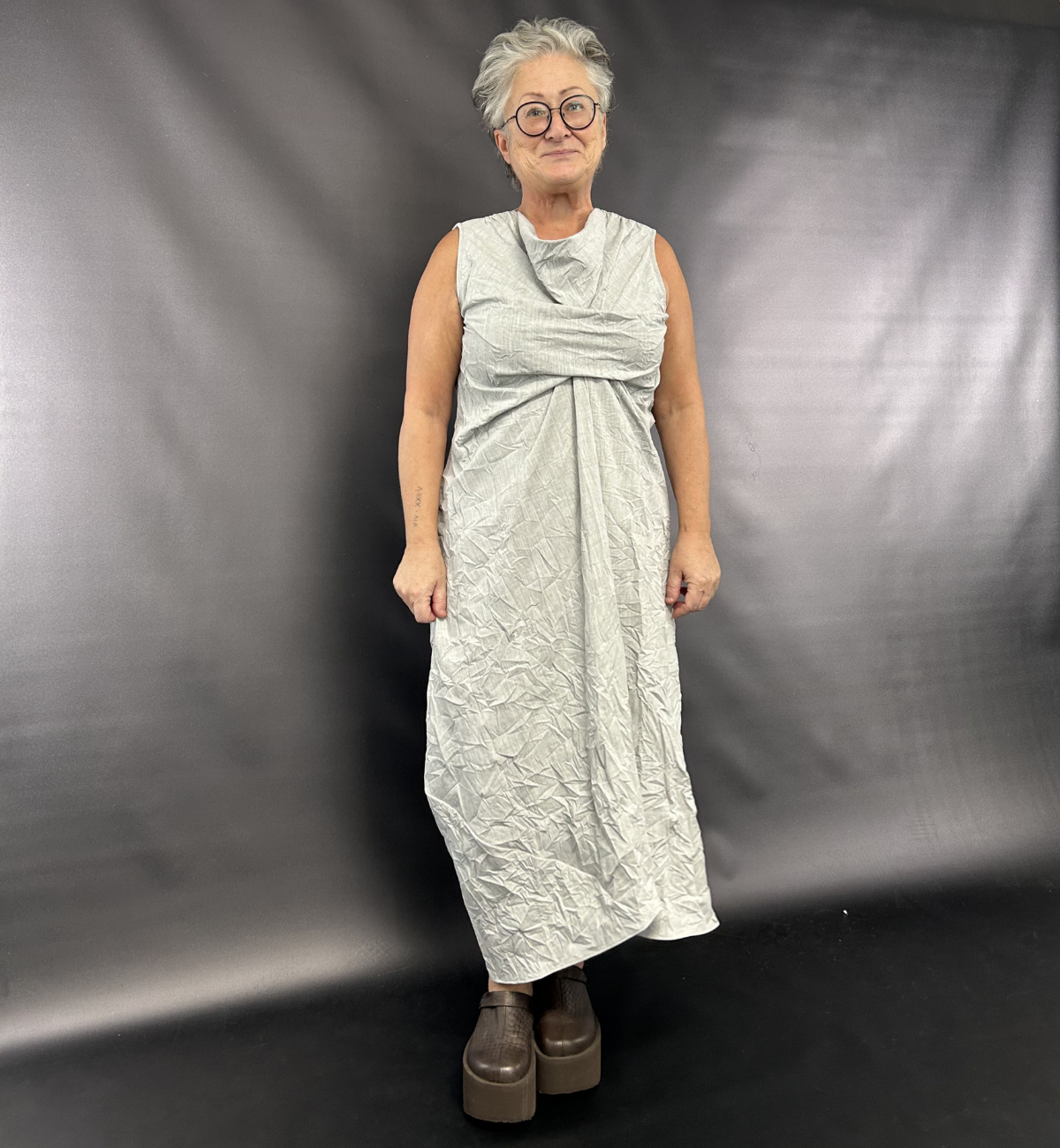 OUTFIT 1 - VAL REACHES FOR THE SORT AARHUS DRESS IN THE GREY COLOURWAY FOR A FLATTERING EVERYDAY EASY LOOK. SHE PAIRS IT UP WITH THE SORT AARHUS SHOE IN THE CHUNKY CLOG FOR ADDED HEIGHT.