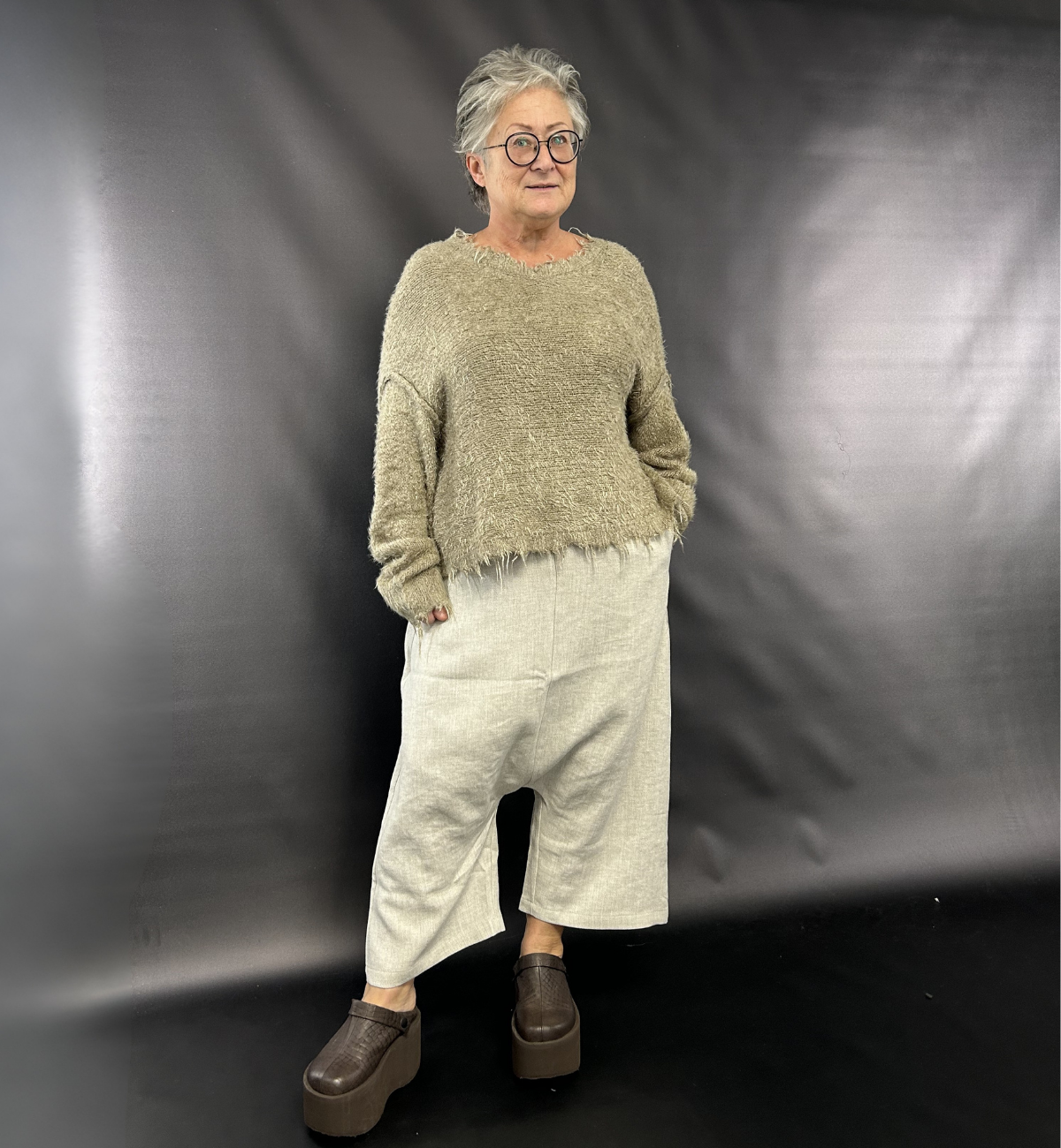 OUTFIT 2 - VAL STYLES THE CULT FAVOURITE SILK PULLOVER IN THE LINEN WITH THE DROP CROTCH SORT AARHUS TROUSER IN THE GREY.