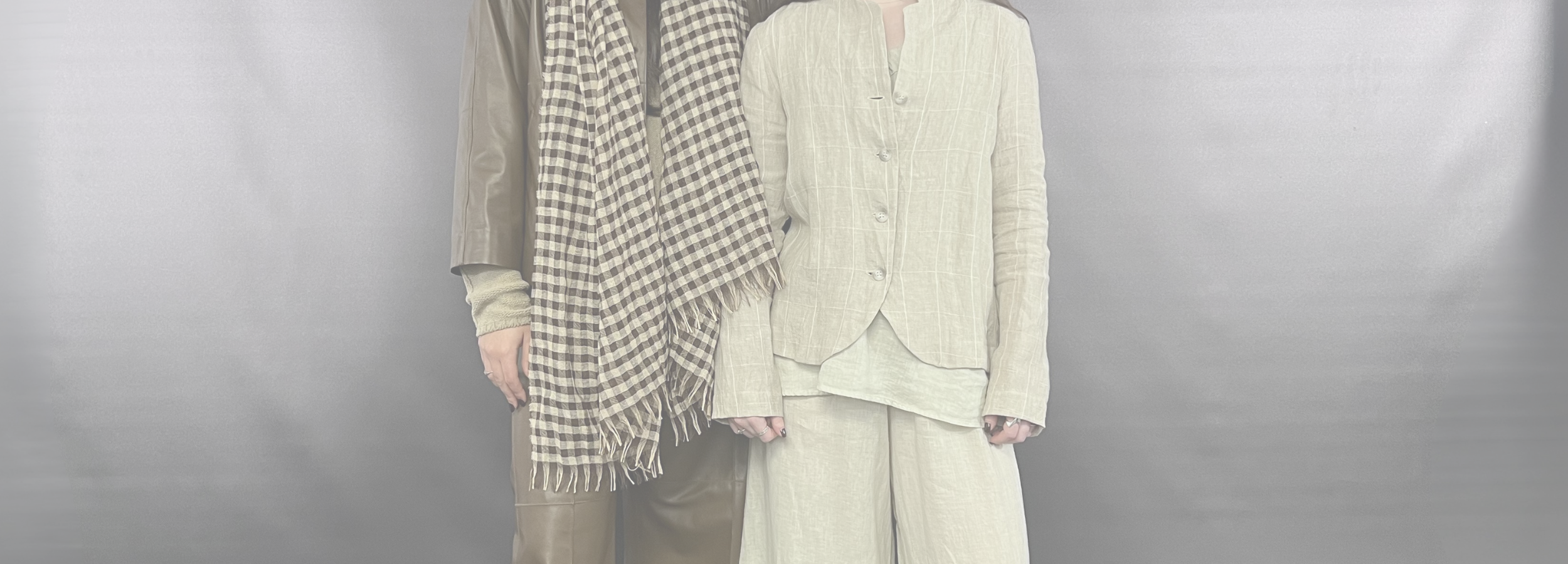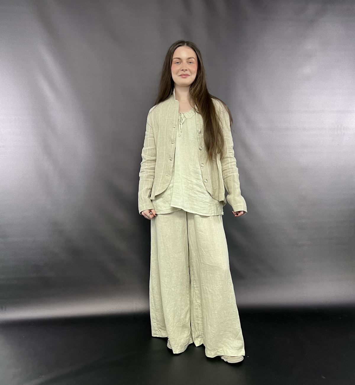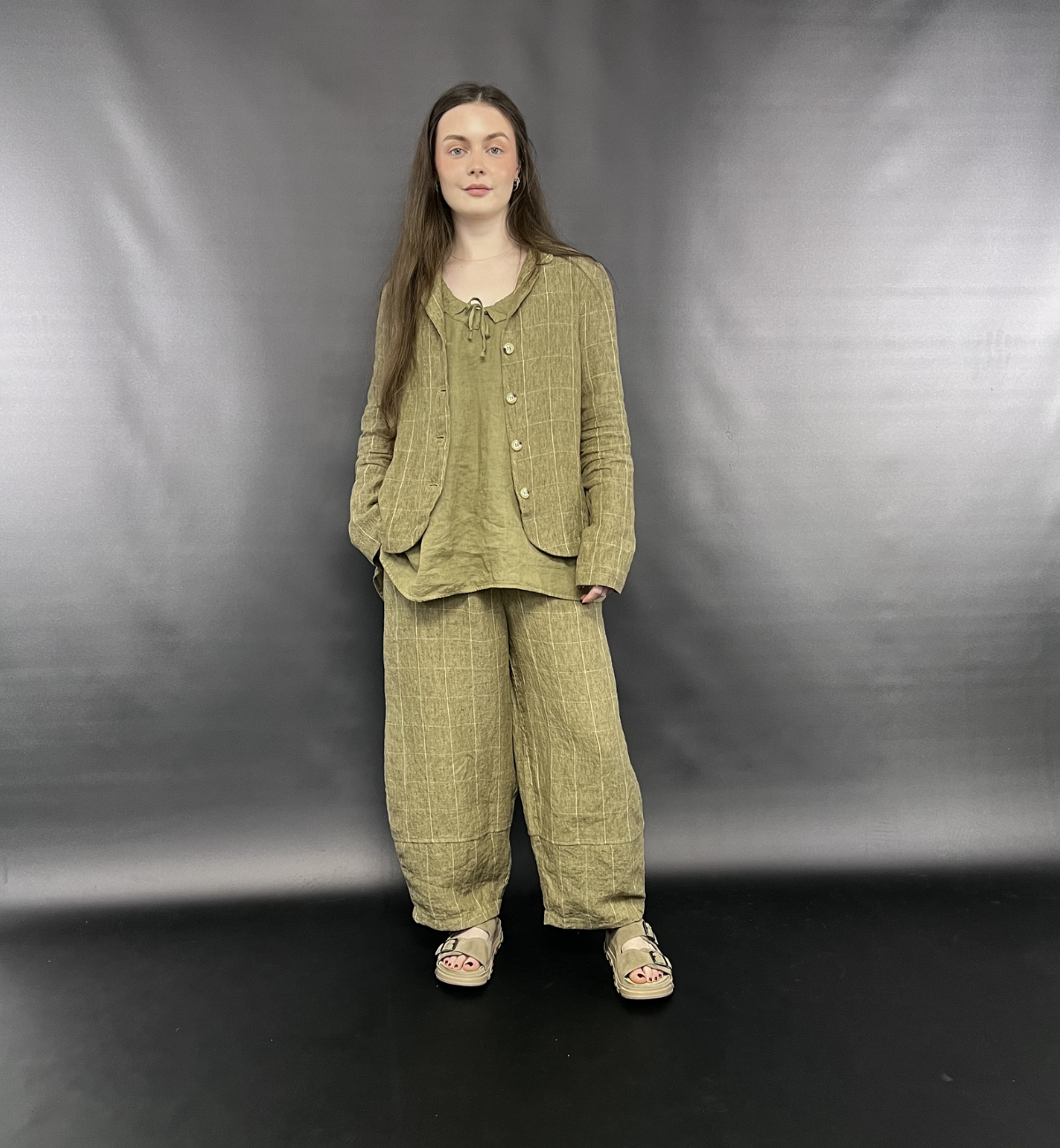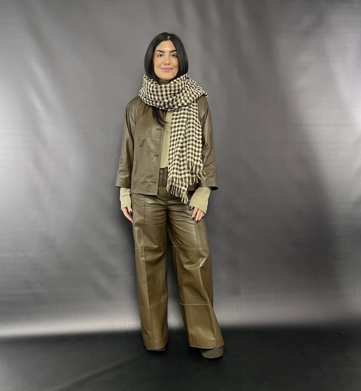 OUTFIT 1 - LYDIA STYLES THE MAMA B RIMA E TROUSER WITH CALMA L TOP LAYERED UNDER THE ADEL E JACKET IN THE CUMINO COLOURWAY.