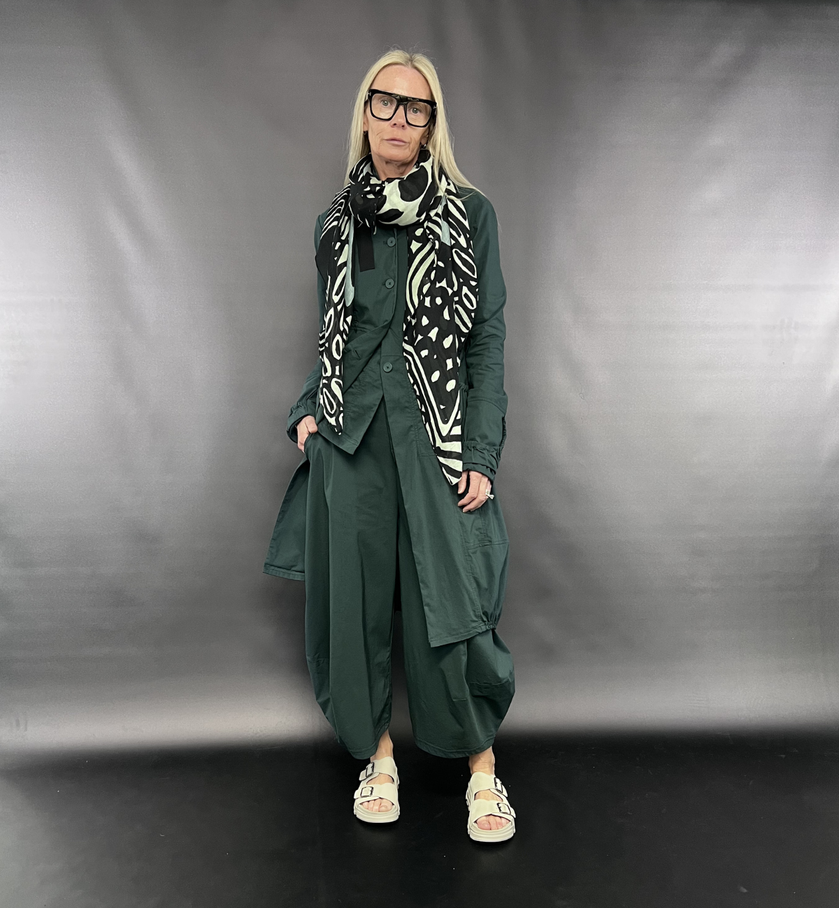 OUTFIT 1 - LIESA STYLES THE TECHNO FABRIC GROUP IN THE TREE COLOURWAY, FINISHED WITH THE 'BLACK MINT LIME PRINT' FOR HER FINISHING TOUCH.