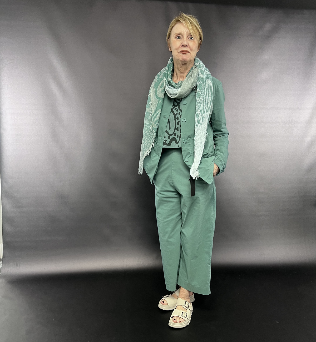 OUTFIT 1 - PAULA STYLES THE 'MINT' COLOURWAY CO-ORD FOR AN EFFORTLESS TRANSITIONAL LOOK.