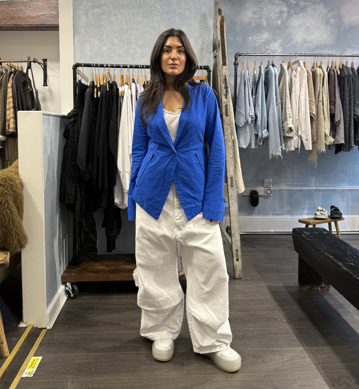 OUTFIT 1 - FOR YAS' FIRST LOOK, SHE STYLES THE NEW IN A-LINE JACKET IN ELECTRIC WITH THE ELEMENTE CLEMENTE ADIALA TOP AND SHE FINISHES THE OUTFIT OFF WITH THE MAINLINE PAPER CHALK DENIM TROUSERS.