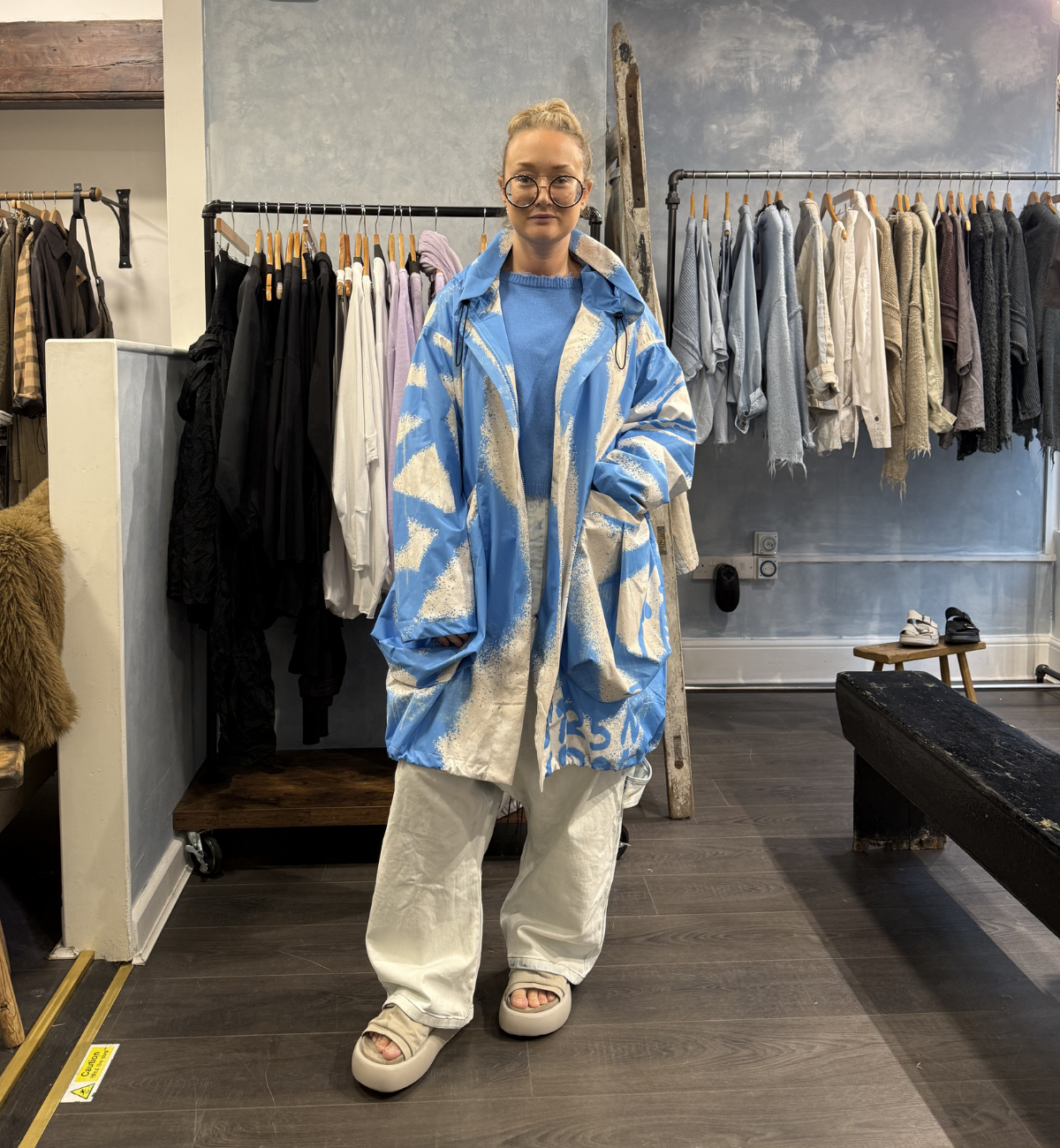 OUTFIT 1 - JADE REACHES FOR THE ICE COLOUR FROM RUNDHOLZ MAINLINE. SHE STYLES THE OVERSIZED WATERPROOF COAT IN ICE PRINT WITH THE ICE PULLOVER AND INDIGO FADED DENIM TROUSERS.