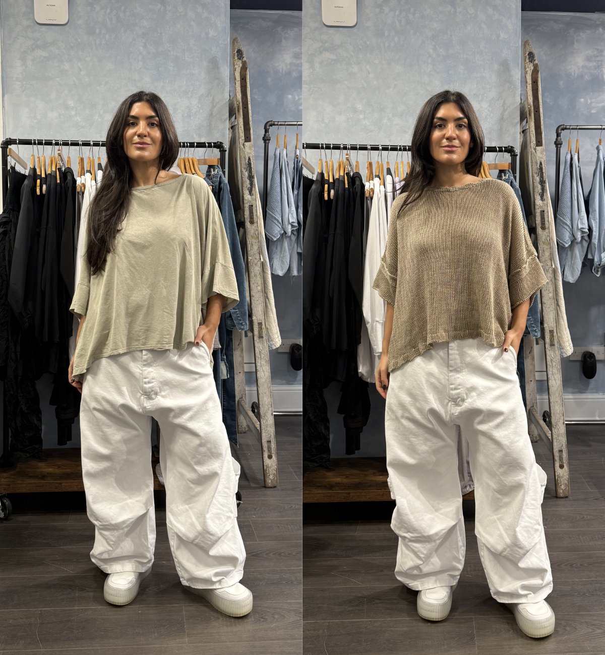 OUTFIT 2 - YAS SHOWCASES THE OVERSIZED TOP IN LINEN FOG FOR A CASUAL BUT PUT-TOGETHER LOOK FOR EVERYDAY WEARING. SHE ALSO QUICKLY SHOWS THE LINEN DIP KNIT IN THE CLASSIC SHAPE WE KNOW AND LOVE.