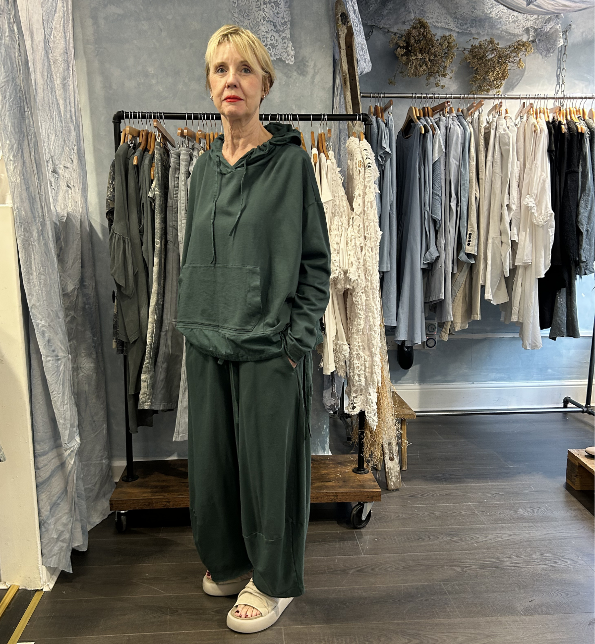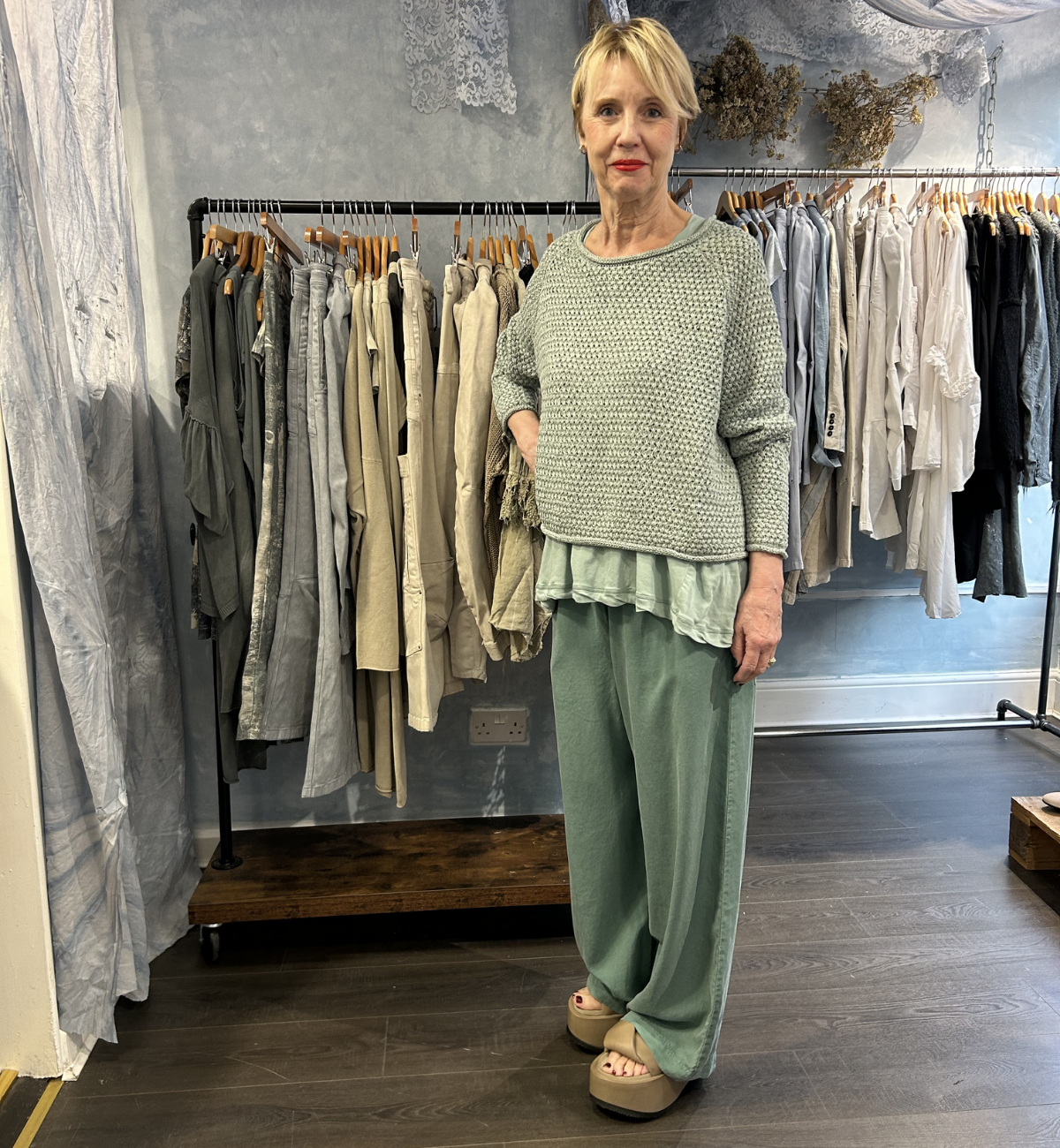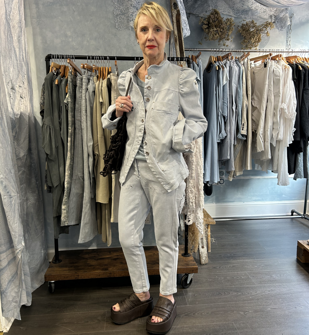 OUTFIT 1 - PAULA STYLES A NEW STYLE TROUSER FROM RUNDHOLZ DIP IN THE SKY COLOURWAY, PAIRED WITH THE MATCHING JACKET ALSO IN THE SKY COLOURWAY.