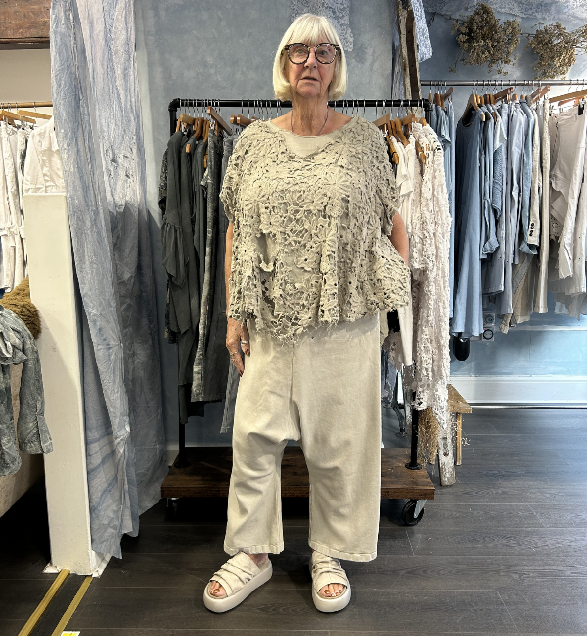 OUTFIT 2 - JILL STYLES THE LACE TOP FROM DIP WITH THE RUNDHOLZ DIP JEAN IN THE LINEN FOG.